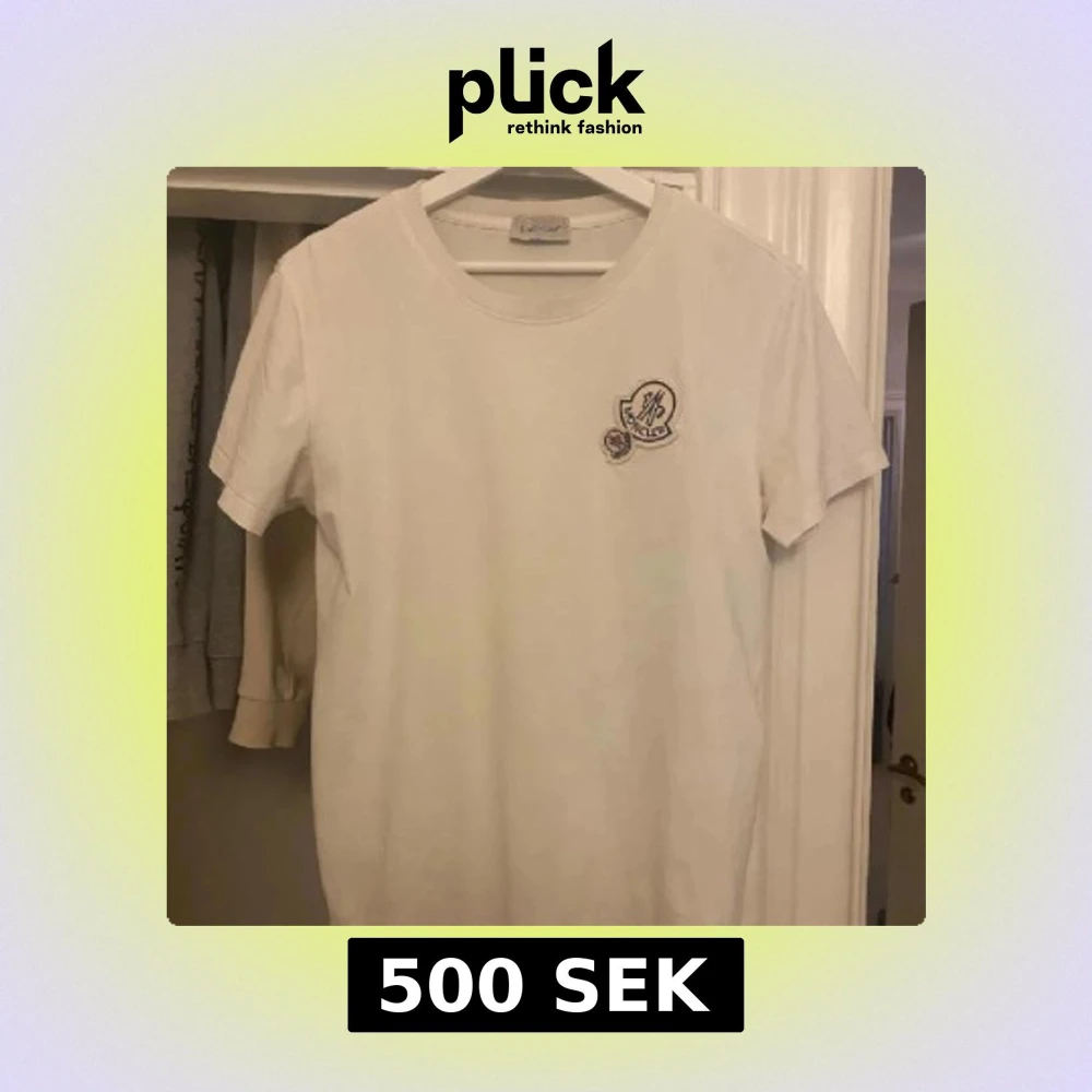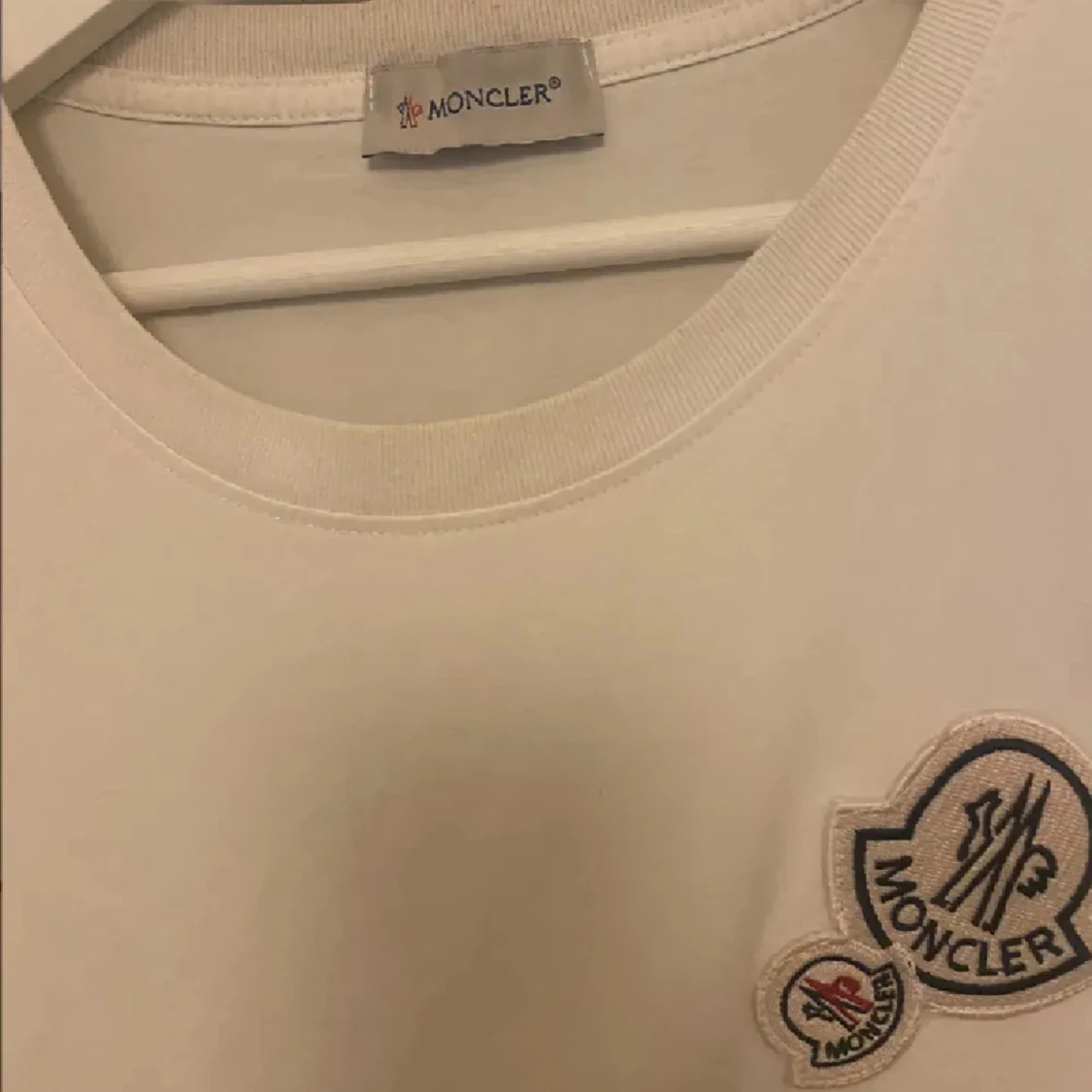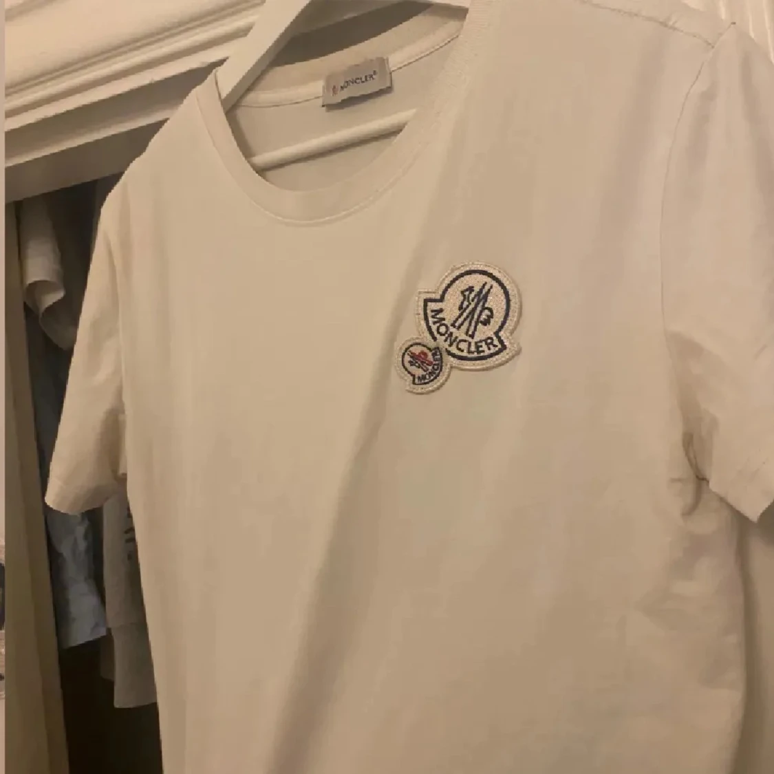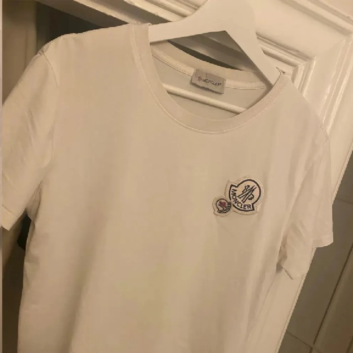 Vit t-shirt från Moncler med rund hals och korta ärmar. På bröstet sitter två broderade logopatchar i vitt, svart och rött som ger en clean och exklusiv vibe. Materialet är mjuk bomull och passformen är normal. Perfekt för dig som gillar stilrena märkesplagg.