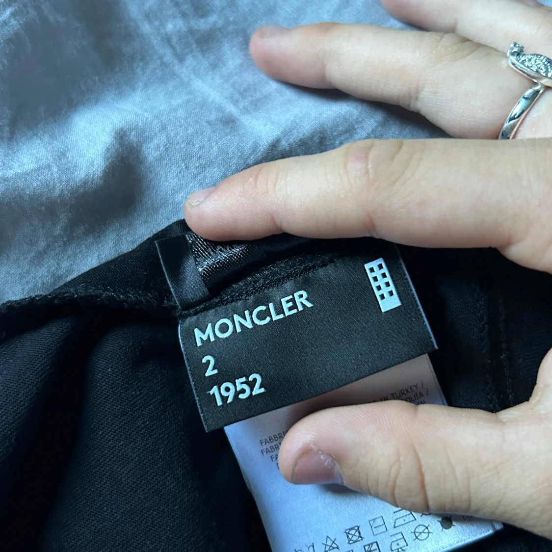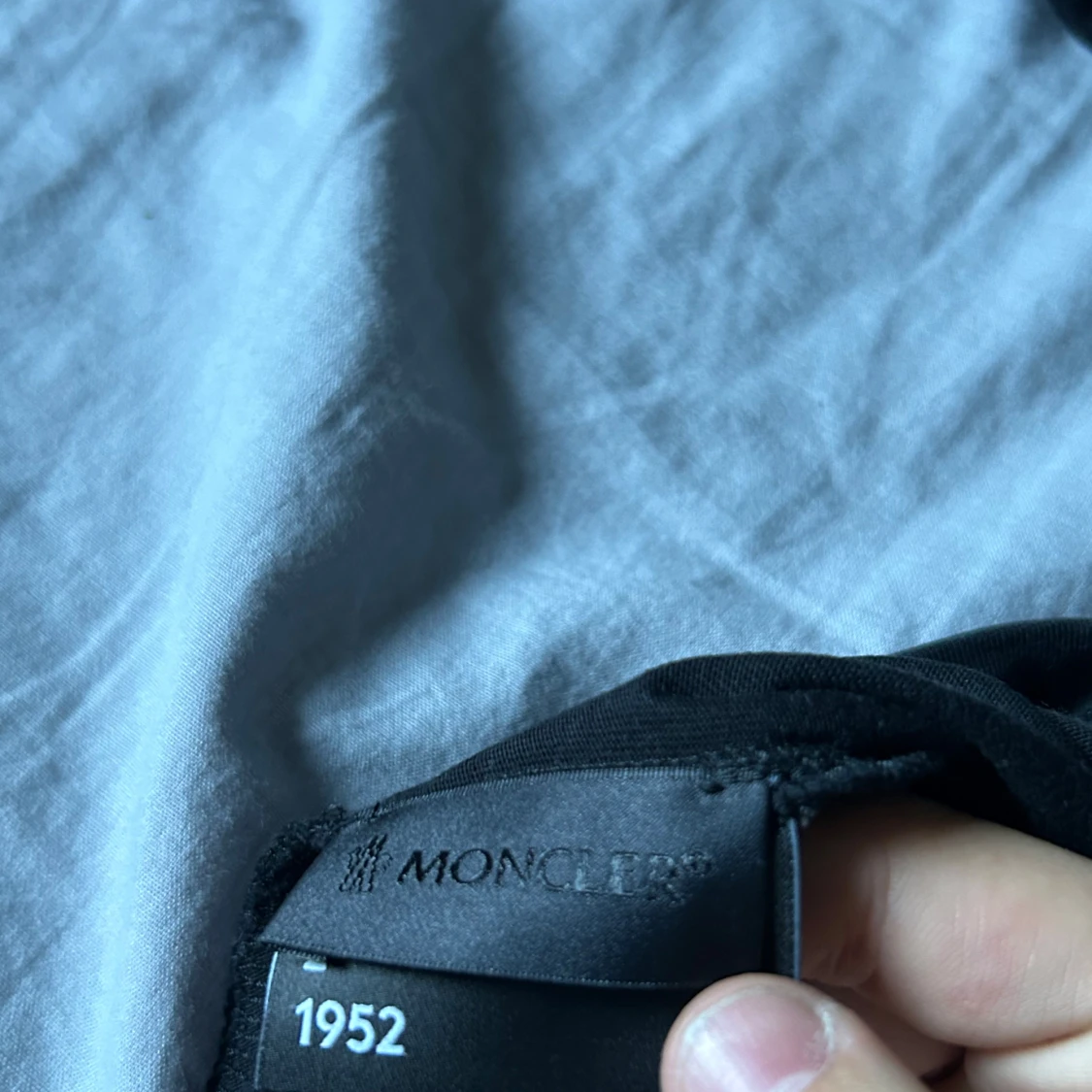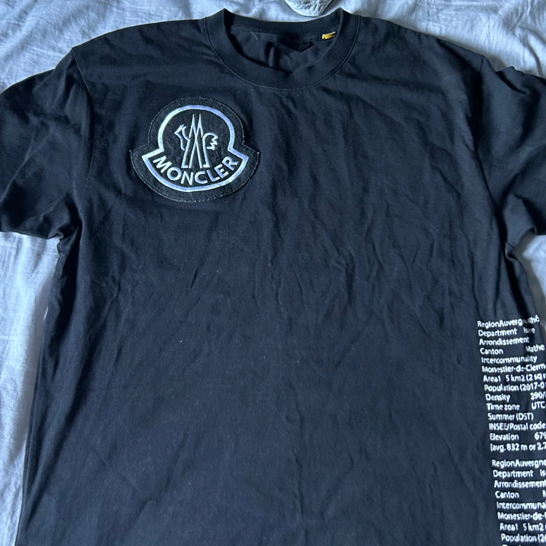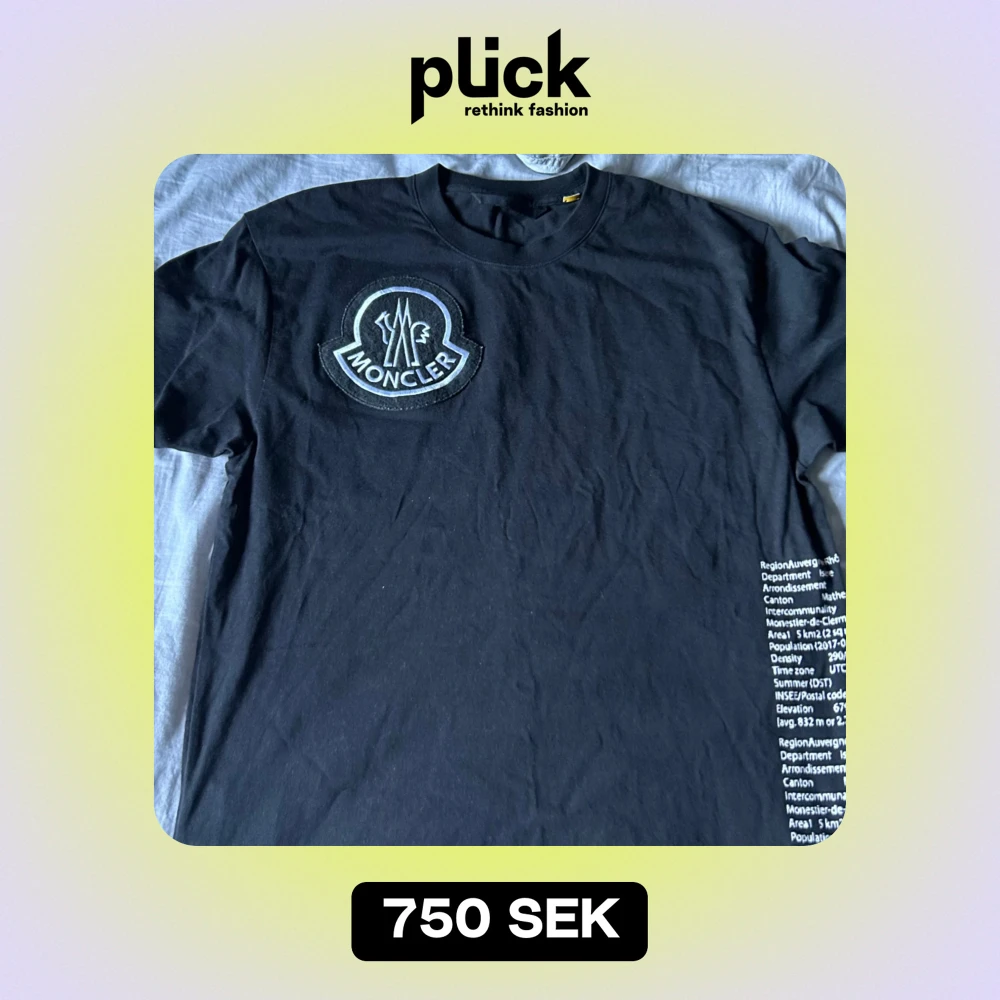 Säljer en svart t-shirt från Moncler i mycket bra skick. Den har ett stort Moncler-märke på bröstet och textdetaljer på baksidan. Perfekt för en stilren och avslappnad look. Passar bra till både vardag och fest!