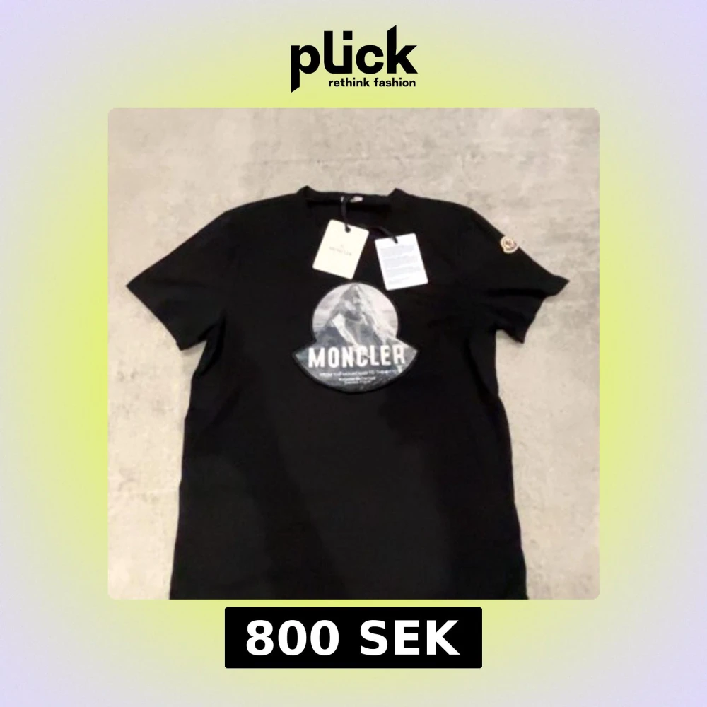 Säljer en svart t-shirt från Moncler med stort tryck av berg och logga på bröstet samt broderad logotyp på ärmen. Klassisk passform och rund halsringning. Perfekt för dig som gillar stilrena märkesplagg. Den passar en som har storlek L.