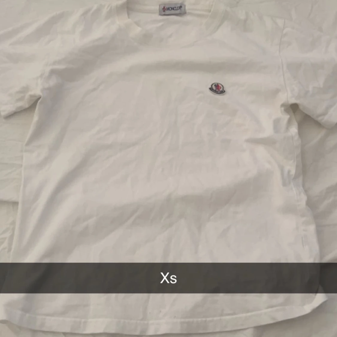Säljer en stilren vit t-shirt från Moncler med korta ärmar och en liten logga på bröstet. Perfekt för en avslappnad look. Passar bra till jeans eller shorts. 🕶️