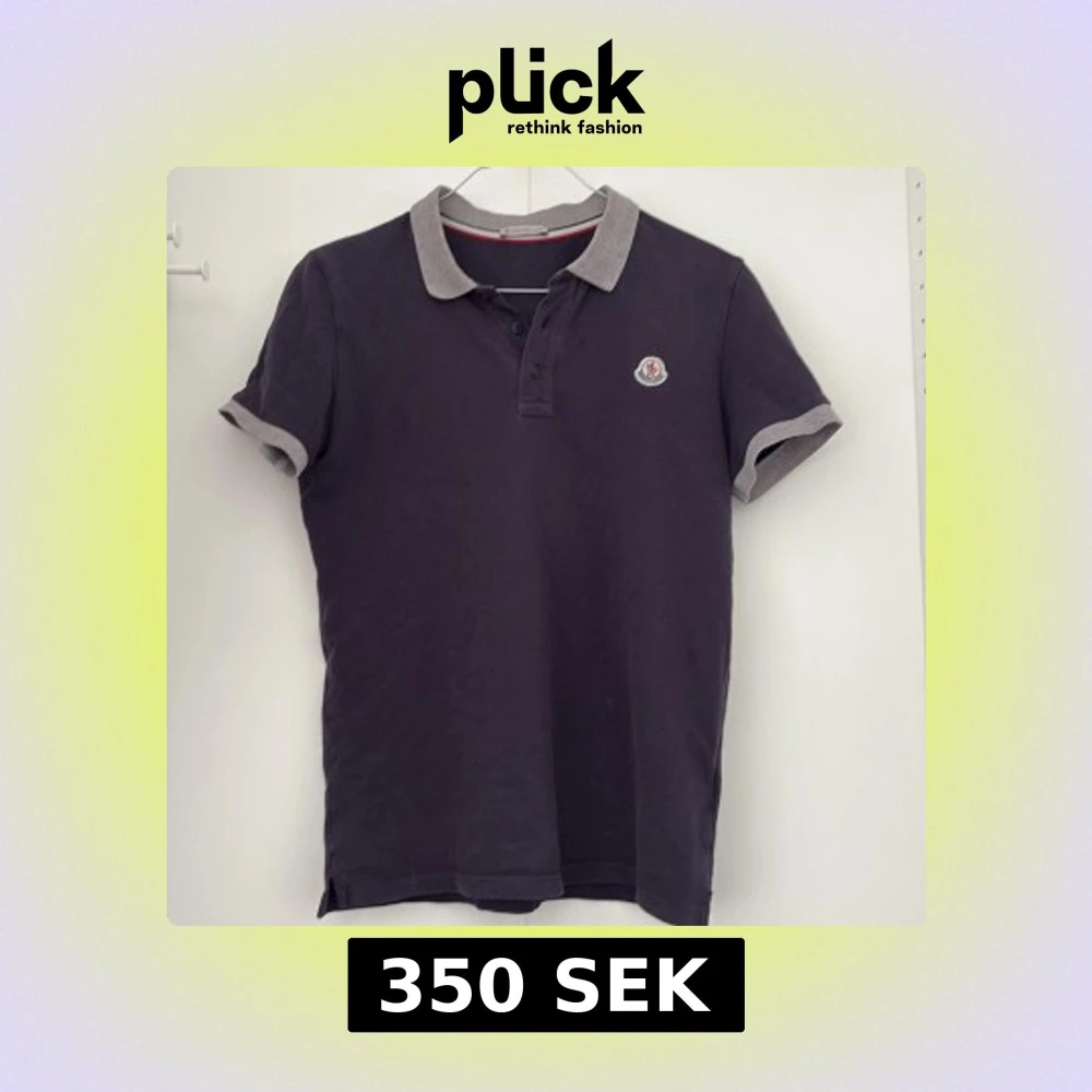 Säljer en mörkblå pikétröja från Moncler med grå krage och ärmslut. Tröjan har knappslå framtill och Moncler-logga på bröstet. Perfekt för en stilren och sportig look.
