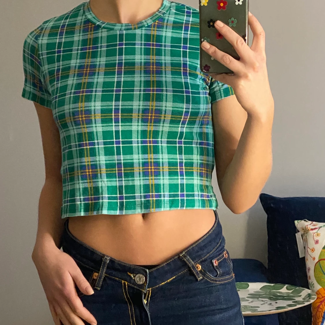 Grön / rutig T-shirt i kort modell med stretchigt tyg. Köpt för 2 år sedan, i mycket gott skick.