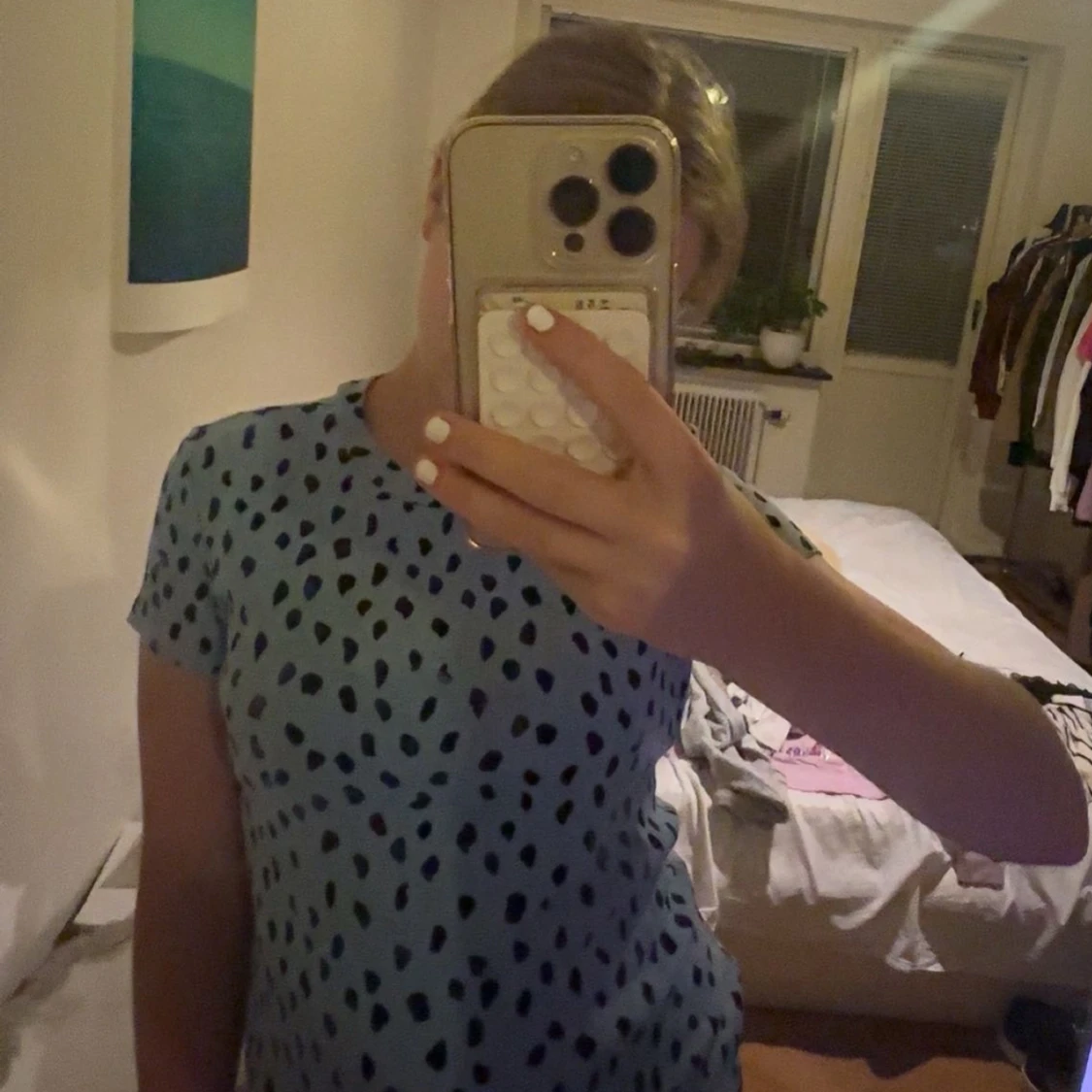 Säljer en blå tröja med svarta prickar och rund hals. tröjan har korta ärmar och är figurnära i modellen. Perfekt för dig som gillar färg och mönster! Materialet känns mjukt och lätt mot huden.