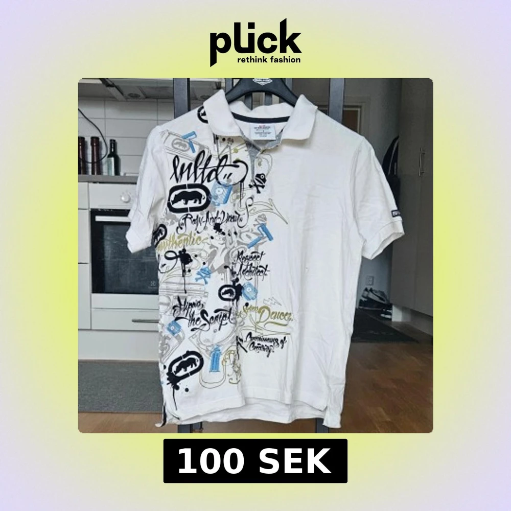 Vit piké t-shirt från Ecko Unltd. med coolt grafiskt tryck i svart, blått och gult på både fram- och baksidan. Klassisk krage och korta ärmar. 100% bomull, perfekt för en streetwear-look.