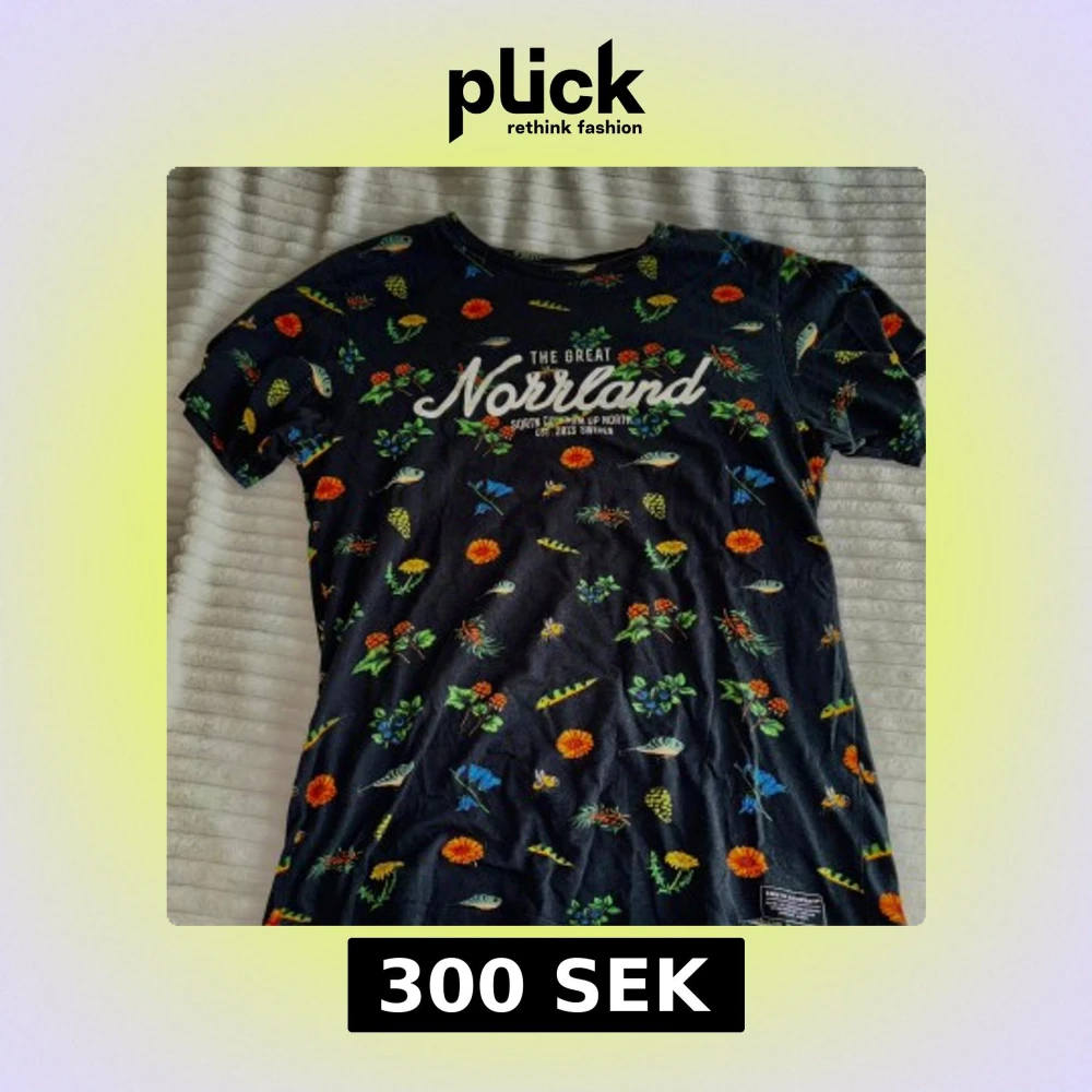 Cool svart t-shirt från Sqrtn Company med färgglada blommor, fiskar och växter över hela plagget. Tryck med texten 'The Great Norrland' på bröstet. Perfekt för dig som gillar unik och naturinspirerad stil.