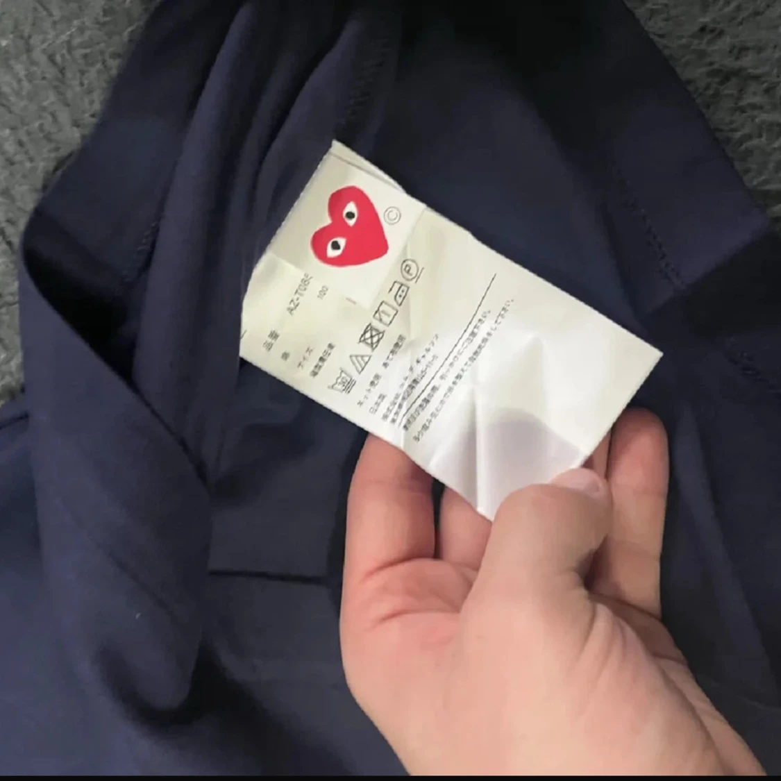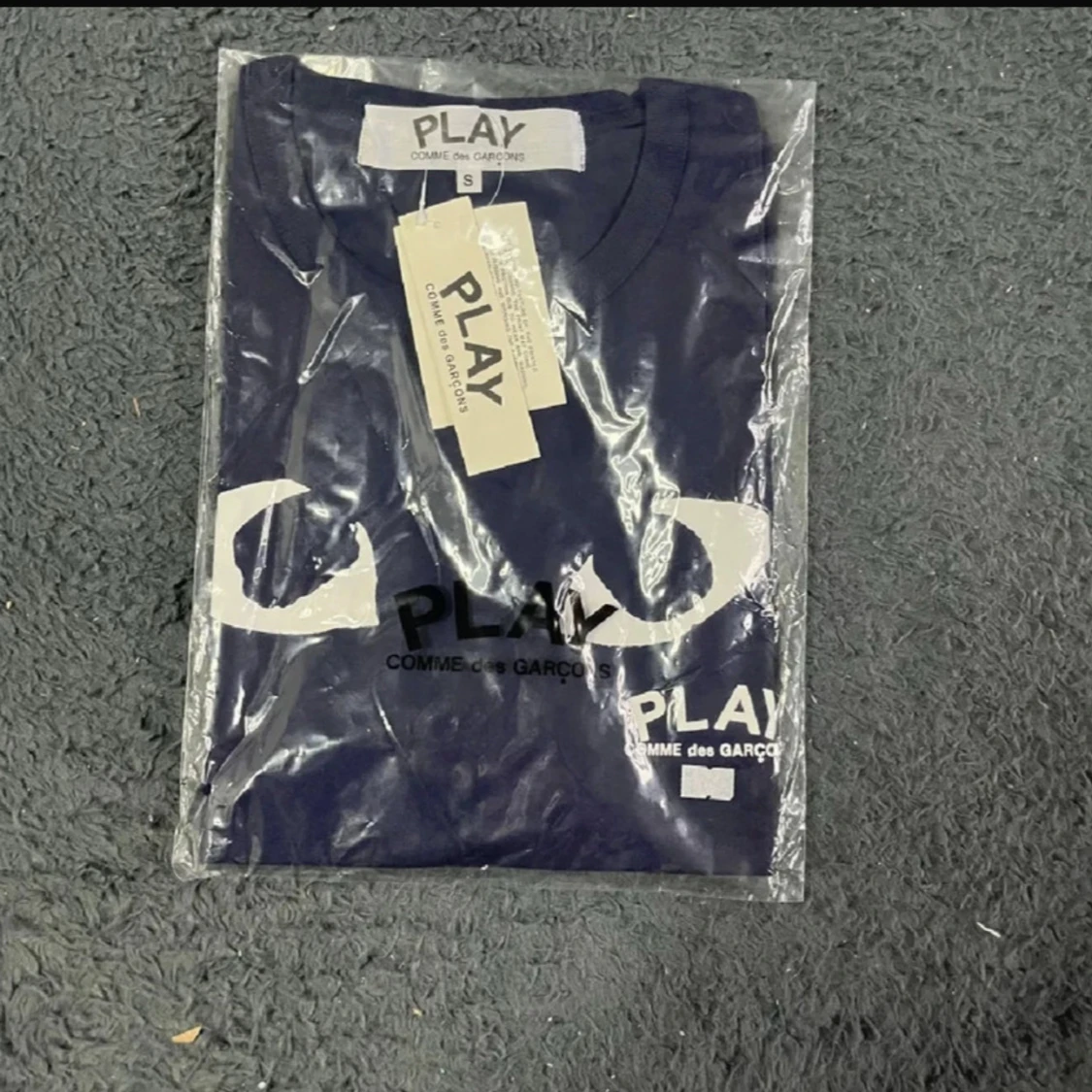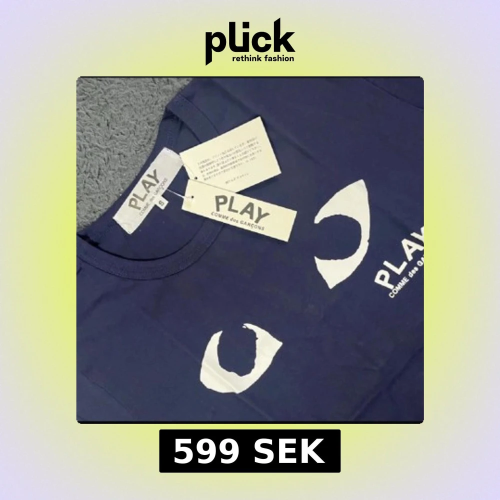 Säljer en mörkblå t-shirt från Comme des Garçons PLAY i storlek S. T-shirten har korta ärmar och är gjord i mjuk bomull. På framsidan finns ett vitt tryck med ögon och PLAY-loggan. Perfekt för dig som gillar streetwear och unik design.