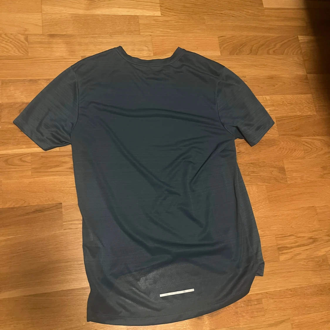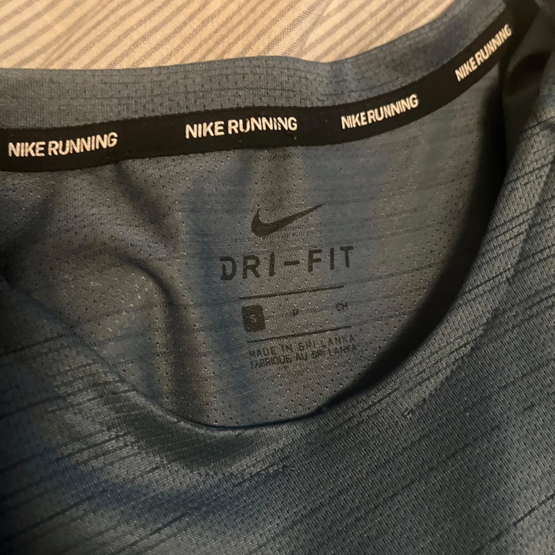 Säljer en mörkblå Dri-FIT t-shirt från Nike, perfekt för löpning. T-shirten har korta ärmar och en liten vit Nike-logga på bröstet. Materialet är lätt och andas bra, vilket gör den idealisk för träning. Storlek S