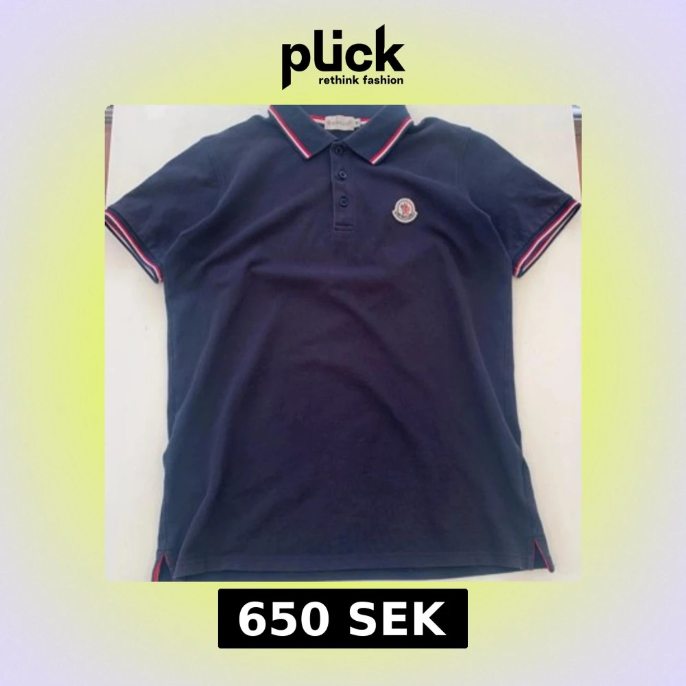 Snygg ny mörkblå pikétröja från Moncler med korta ärmar och klassisk krage. Tröjan har röd och vit randdetalj vid krage och ärmslut samt Moncler-logga på bröstet. Perfekt för en stilren look👌🏻 Inga synliga defekter.