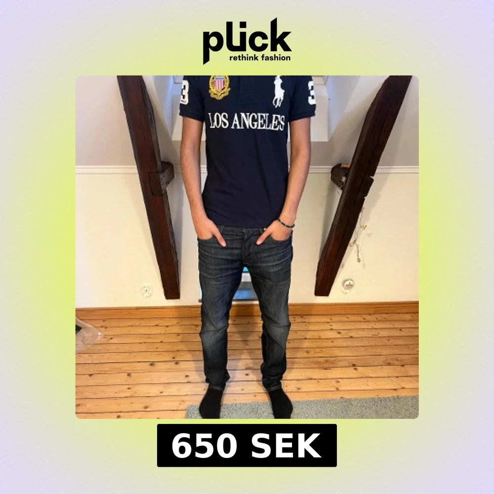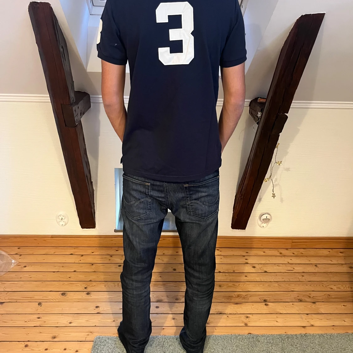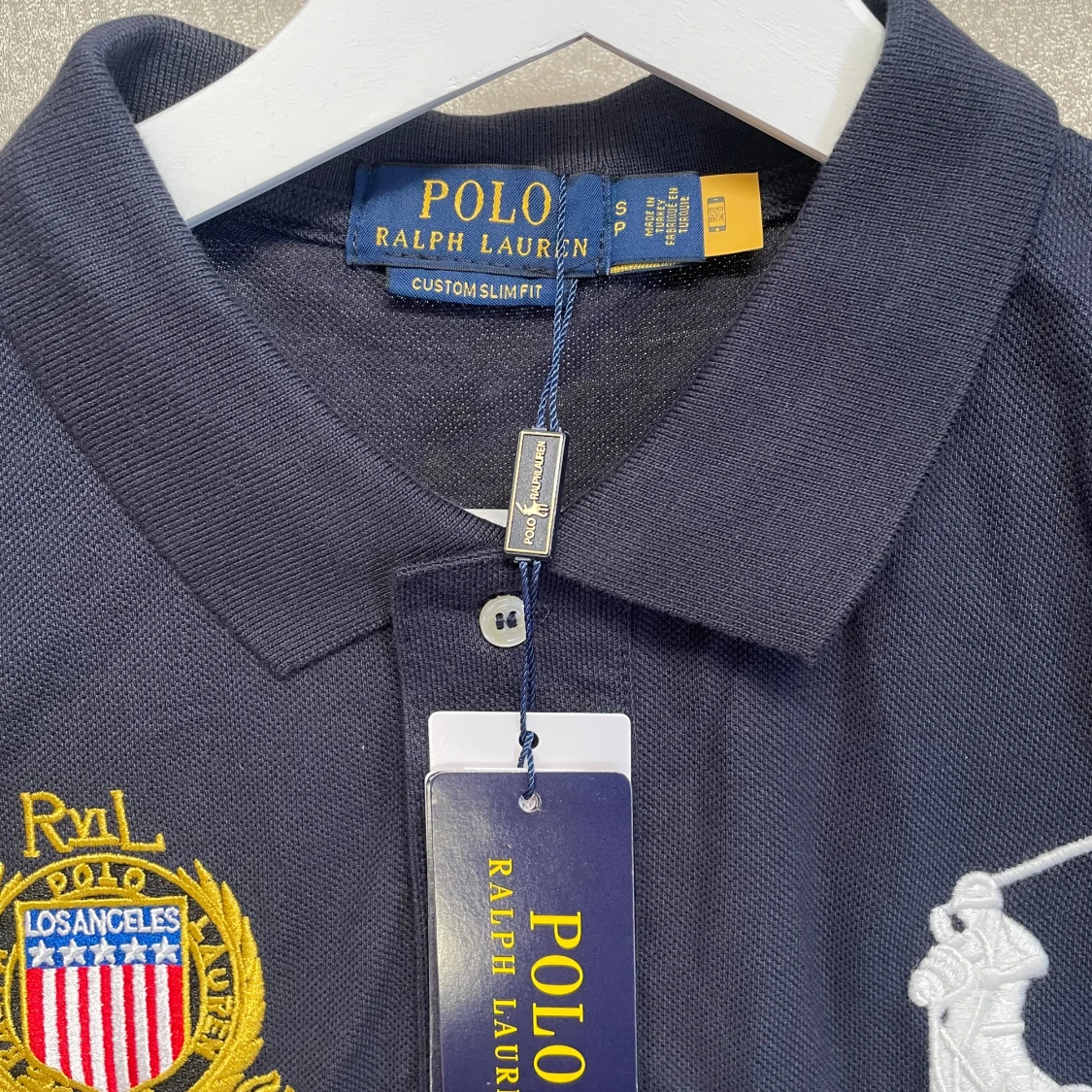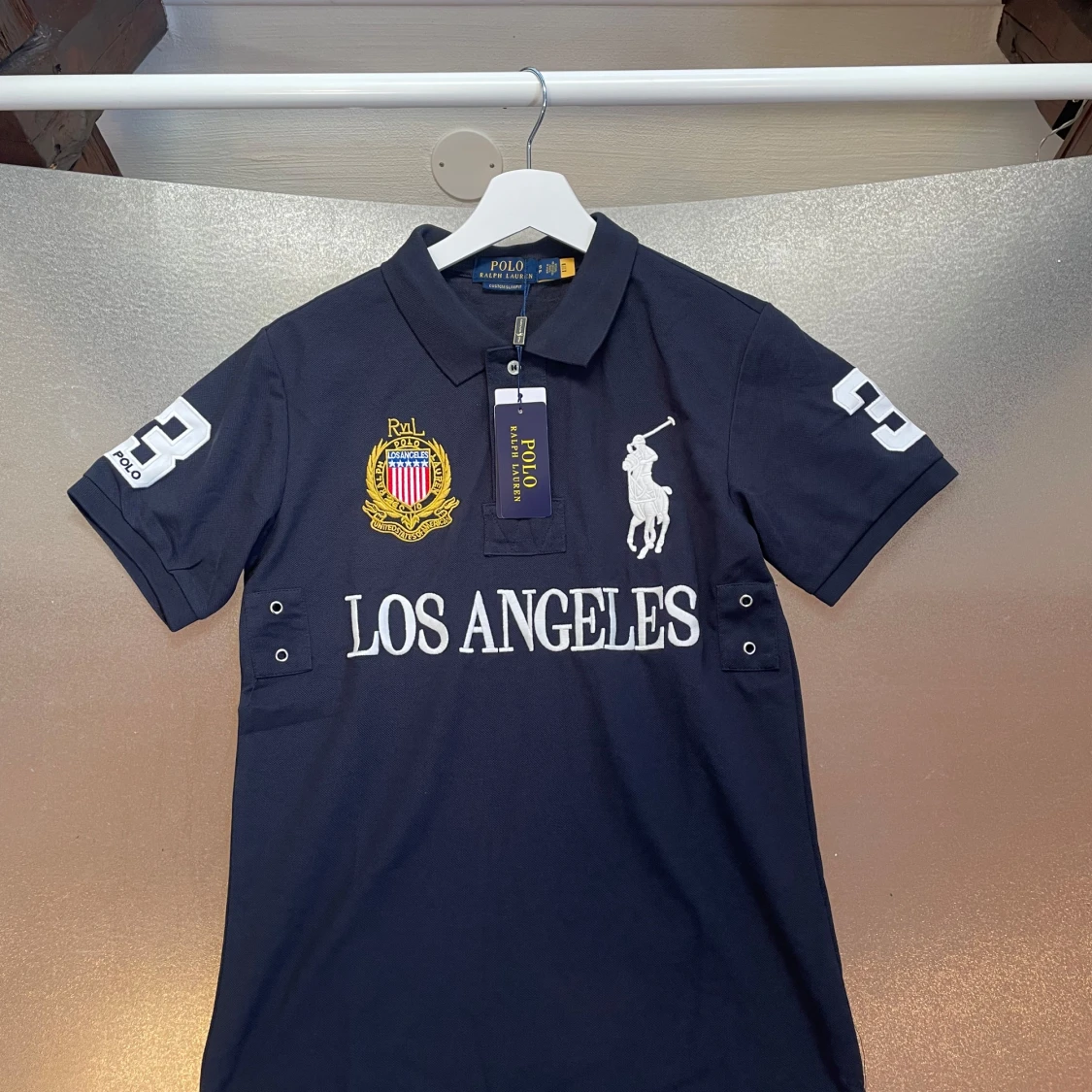 Snygg mörkblå t-shirt från Polo Ralph Lauren med broderad Los Angeles-logga, stort vitt tryck och emblem på bröstet. Klassisk pikékrage, korta ärmar och nummerdetaljer på ärm och rygg. Slim fit-modell i bomull för en clean och sportig look. Påse följer även med. Storlek S.