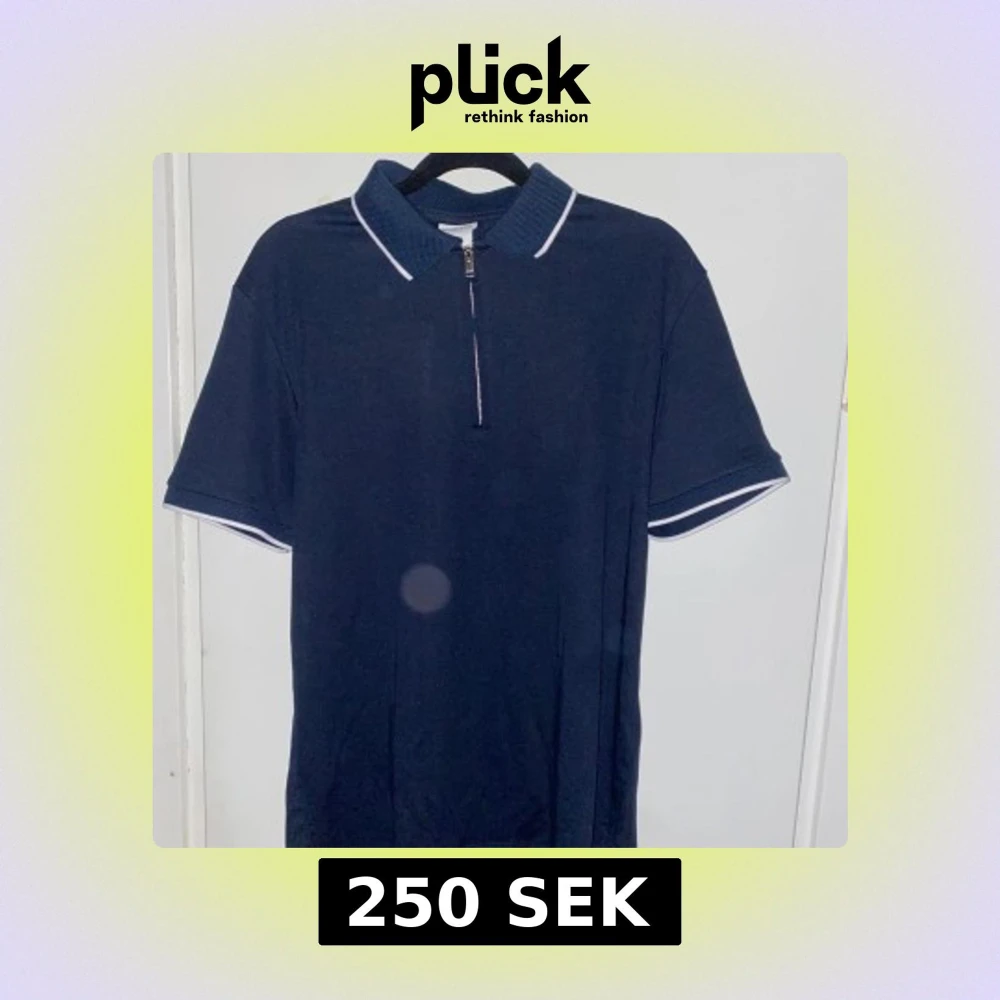 Snygg mörkblå polo t-shirt med vit kant på krage och ärmslut. Perfekt för chill dagar eller när du vill se lite extra fräsch ut.