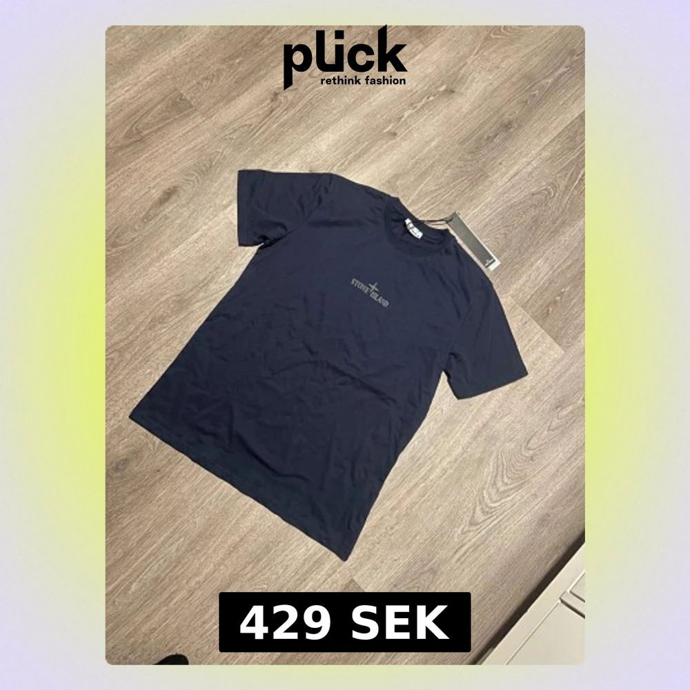 Snygg mörkblå t-shirt från Stone Island med logga tryckt på bröstet och stort tryck på ryggen. Klassisk passform och rund halsringning. Perfekt för dig som gillar streetwear och vill ha något stilrent med en twist.