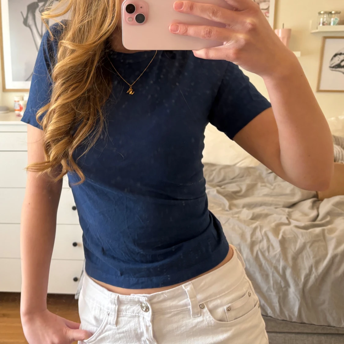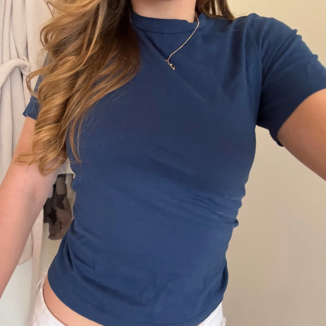 En enkel och stilren mörkblå t-shirt med rund halsringning och korta ärmar. Perfekt att matcha med jeans eller shorts för en avslappnad look.