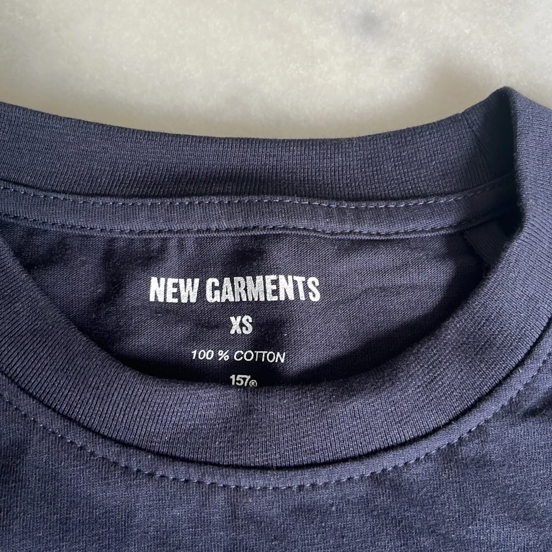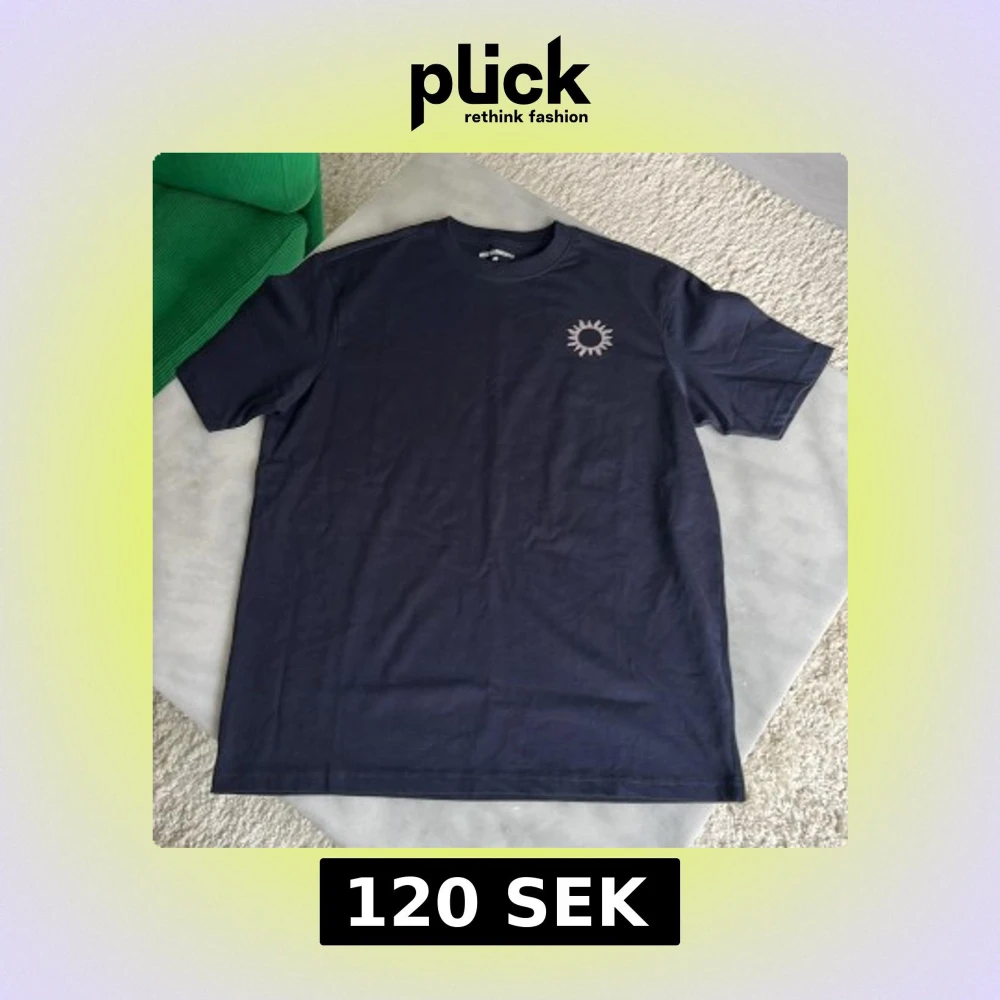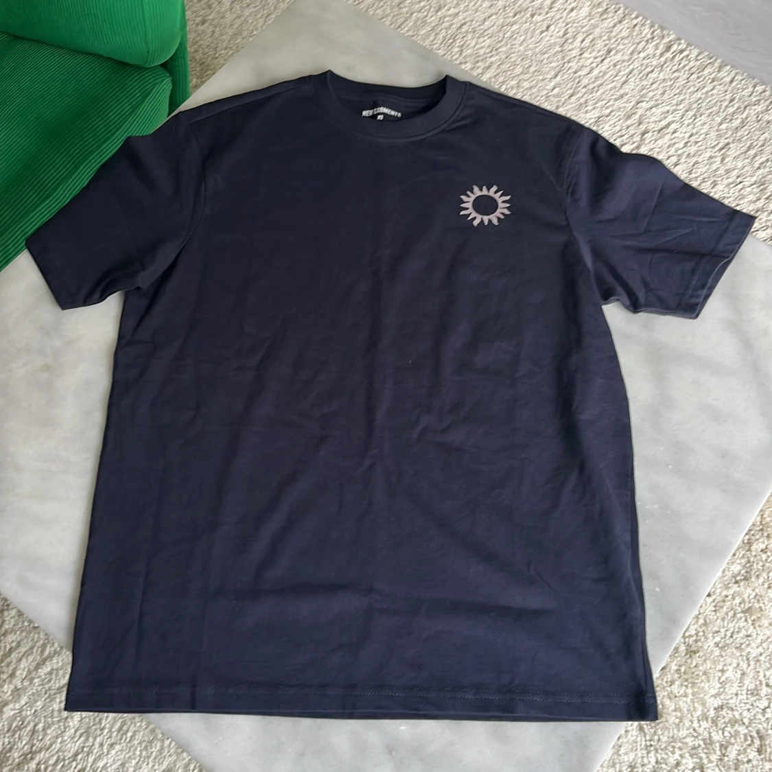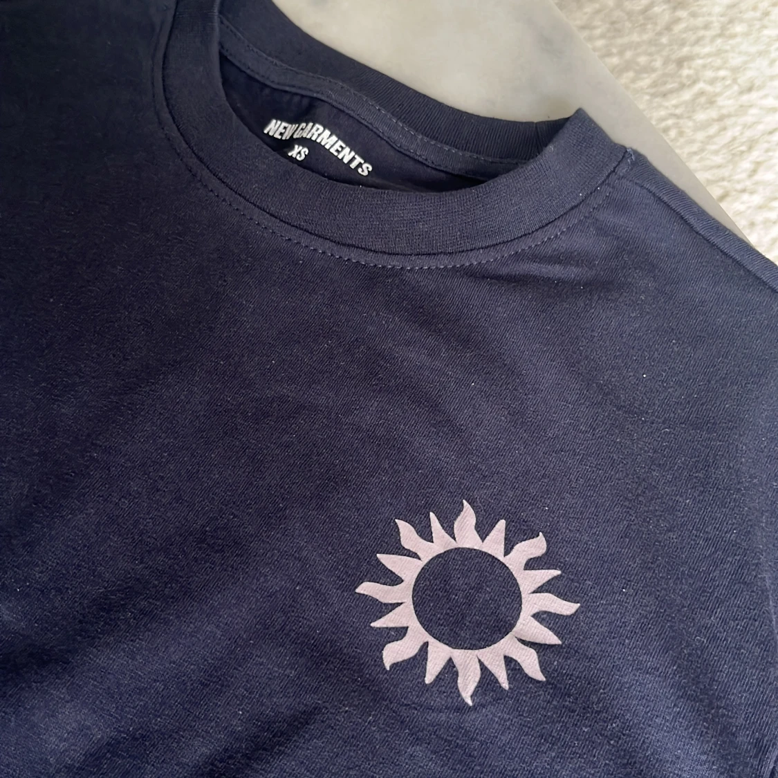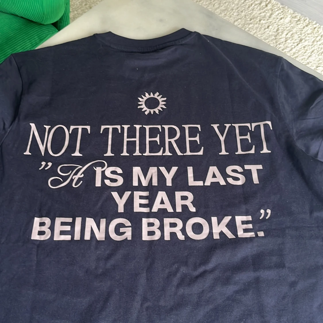 Mörkblå t-shirt i 100% bomull från New Garments. Framtill finns en tryckt solsymbol och på ryggen står texten 'NOT THERE YET "It is my last year being broke."' i vitt. Klassisk passform med rund hals och korta ärmar. Perfekt för dig som vill ha en fet t-shirt till sommaren. Har aldrig använt storlek XS men sitter som S.