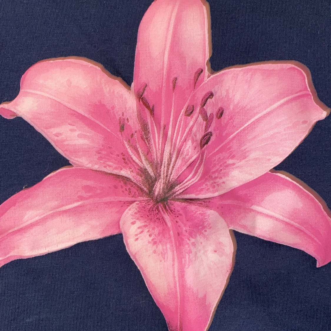 Mörkblå t-shirt från FB Sister i storlek S med en stor rosa blomma tryckt på framsidan. Klassisk rund hals och korta ärmar. Perfekt för dig som vill sticka ut med en färgglad och unik detalj. Gjord i mjuk bomull för skön känsla hela dagen.