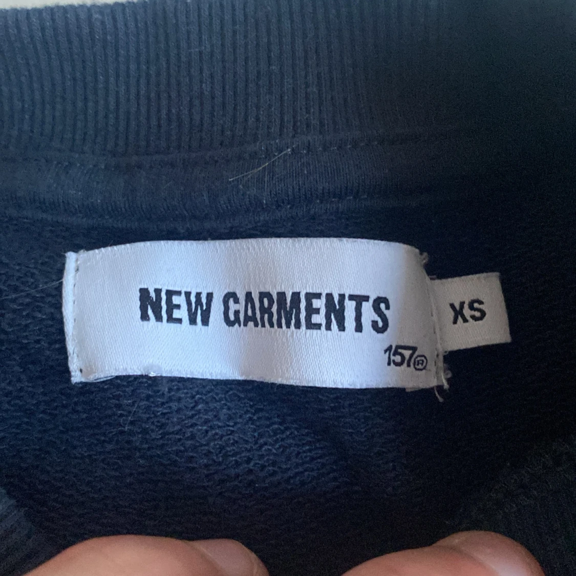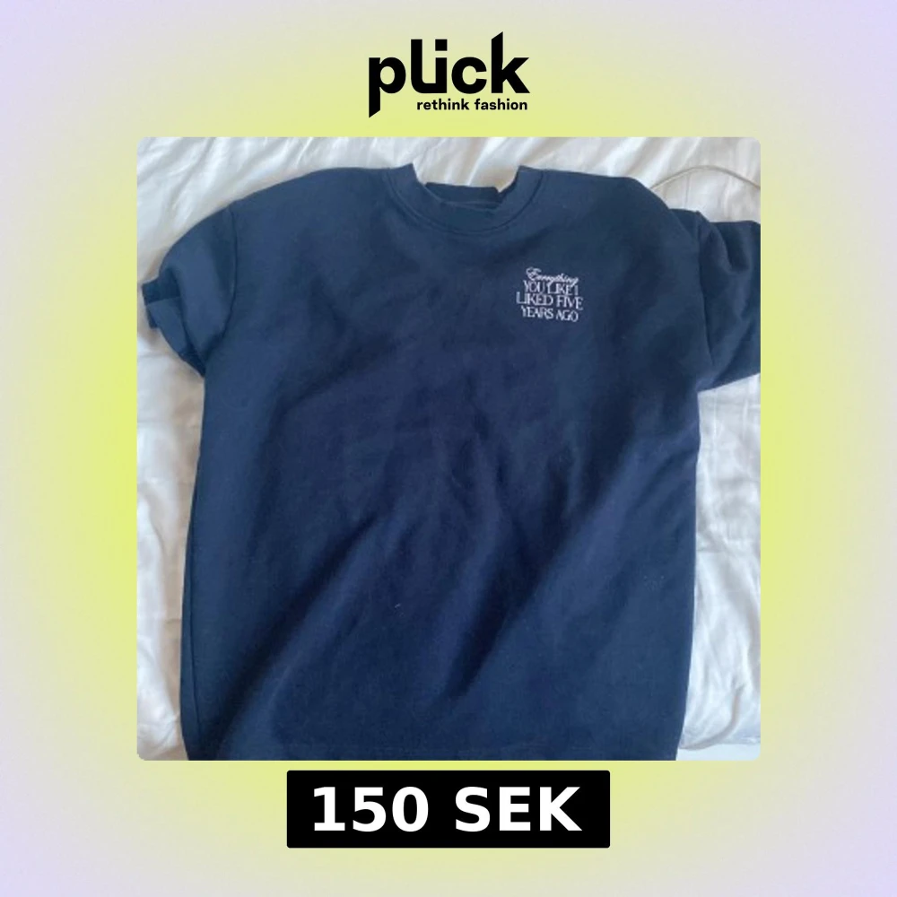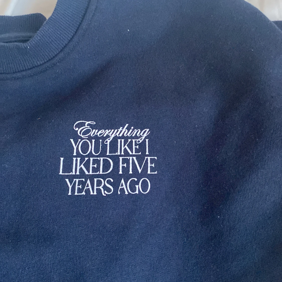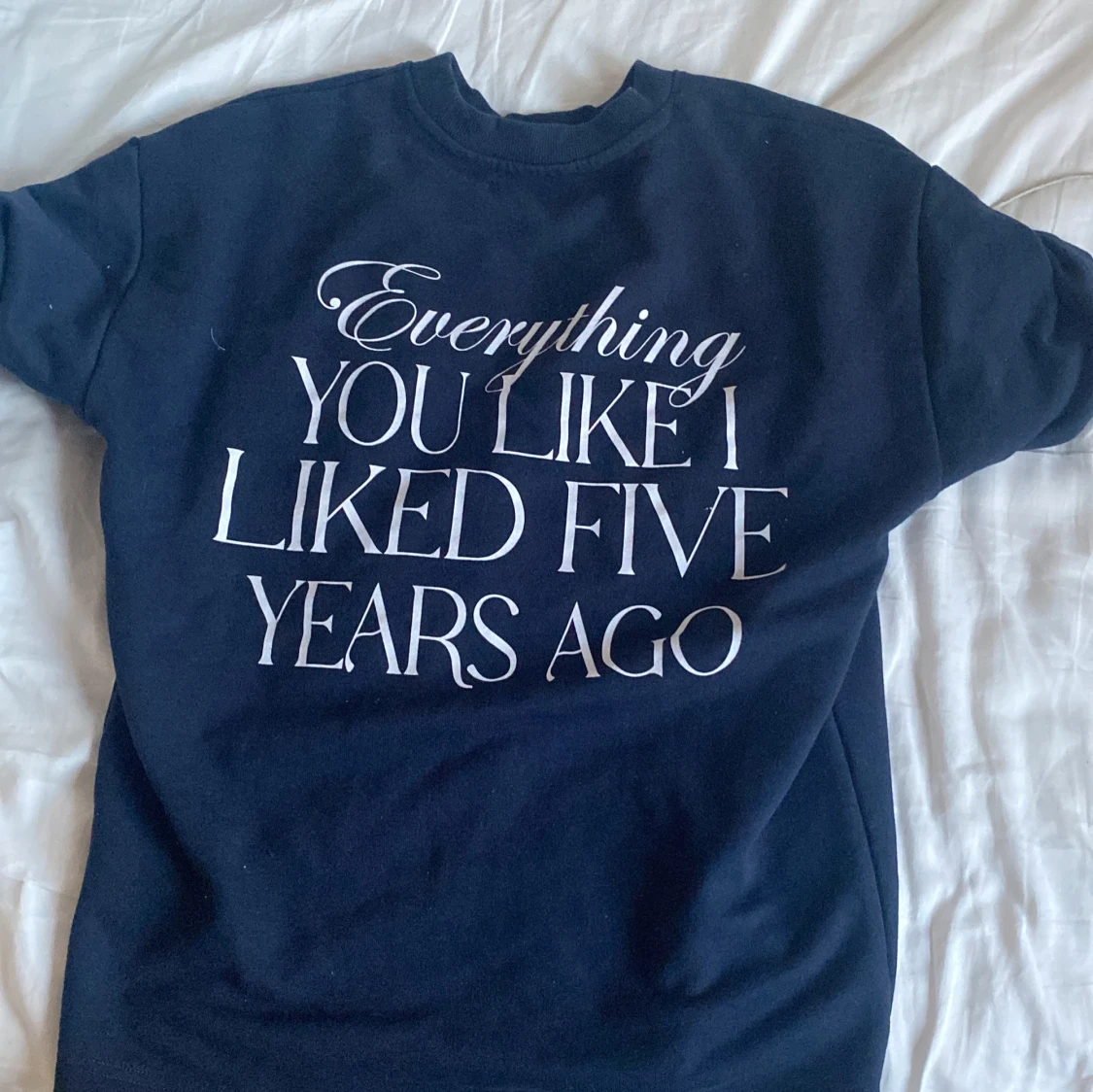 Mörkblå t-shirt från New Garments i storlek XS. Framsidan har ett stort vitt tryck med texten 'Everything you like I liked five years ago'. T-shirten har rund hals och korta ärmar, tillverkad i mjuk bomull. Perfekt för dig som gillar statement-plagg.