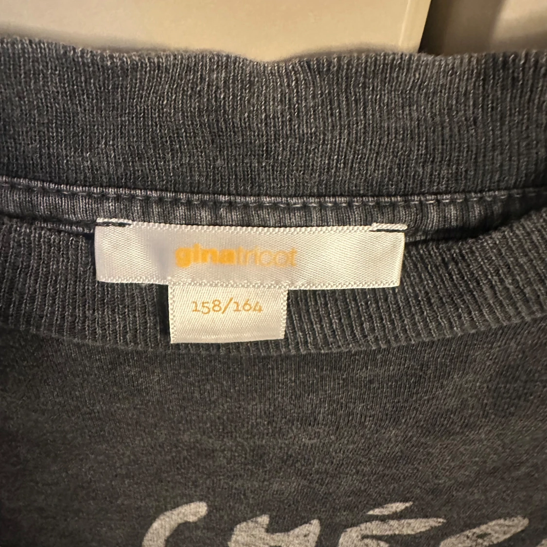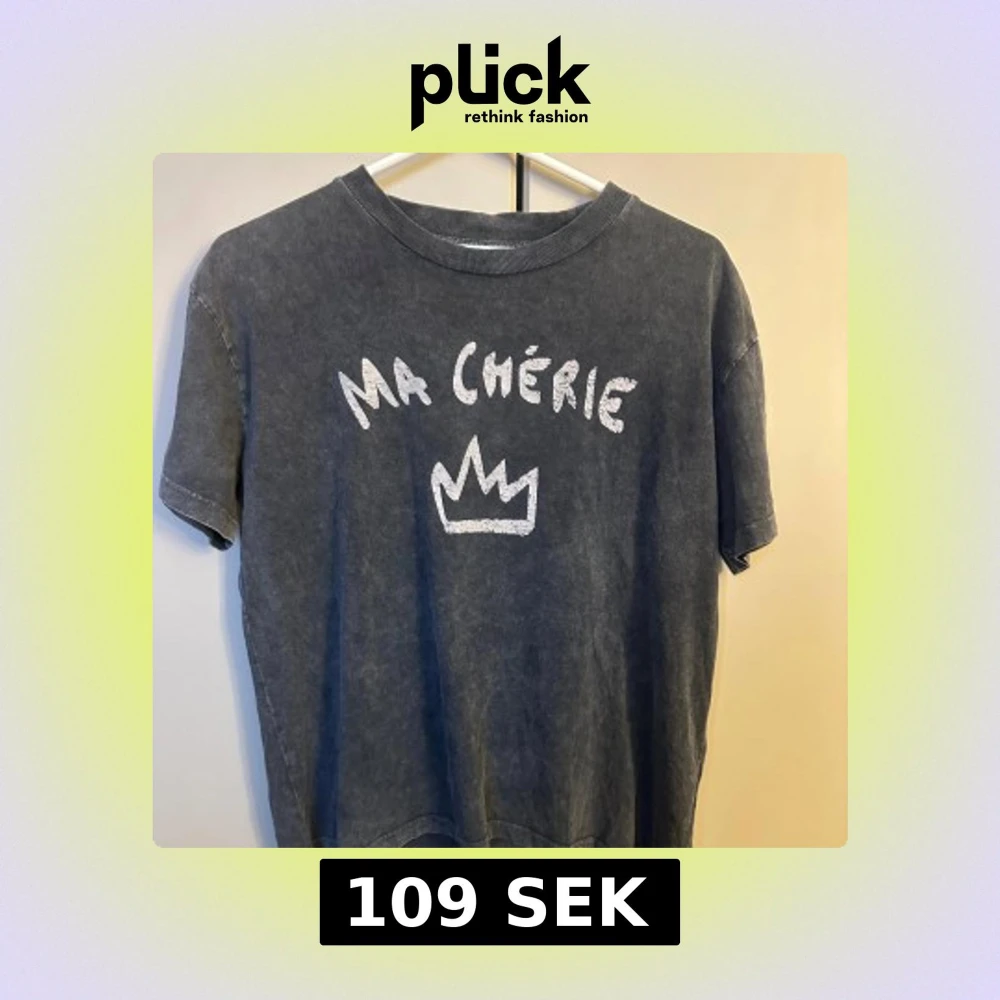 Cool mörkgrå t-shirt från Gina Tricot med vit text 'Ma Chérie' och en krona på bröstet. Klassisk rund hals och korta ärmar. Materialet är mjuk bomull och passformen är normal. Perfekt för dig som gillar chill och enkel stil.