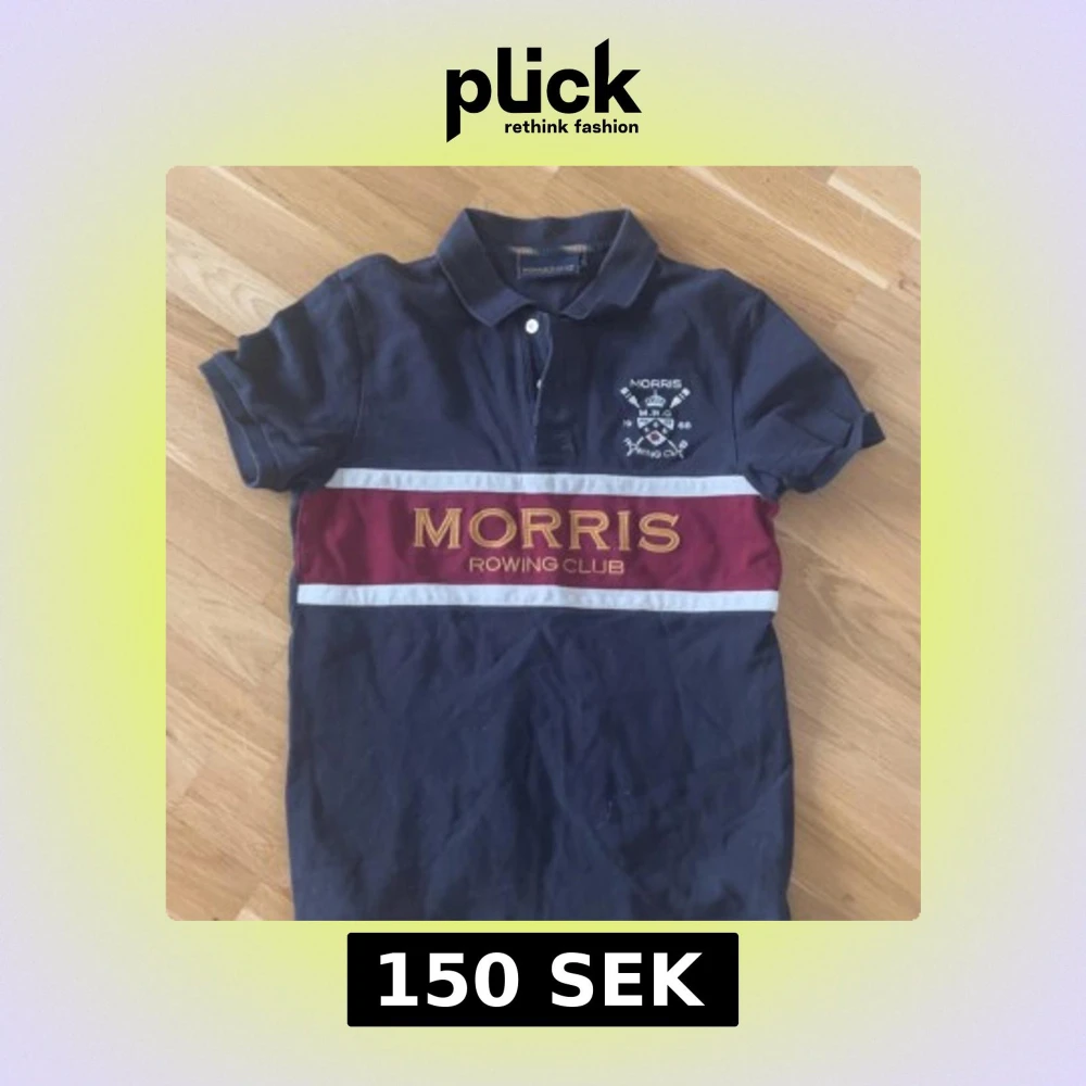 Säljer en mörkblå pikétröja från Morris Rowing Club med vit och vinröd rand över bröstet och stor gul text. Tröjan har klassisk krage, korta ärmar och broderad logga på bröstet. Perfekt för en sportig och stilren look.