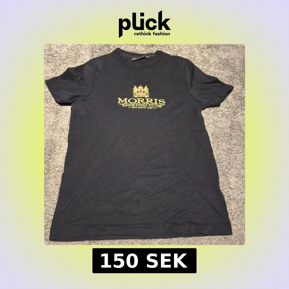 Mörkblå t-shirt från Morris Sporting Club i storlek XS. Klassisk rund hals och korta ärmar. Framsidan har ett gult tryck med Morris logga och emblem. Mjuk och skön bomull som passar perfekt till jeans eller shorts. Snygg och enkel design med stilren vibe.