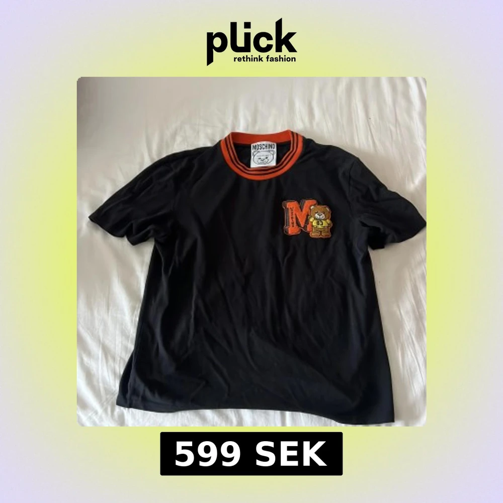 Svart t-shirt från Moschino med orange och svarta ränder på kragen. På bröstet finns en stor broderad patch med ett orange M och Moschinos ikoniska nalle i gul tröja. T-shirten har korta ärmar och är gjord i mjuk bomull. Perfekt för dig som gillar streetstyle och coola detaljer.