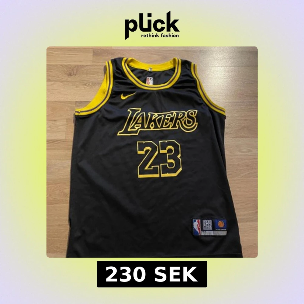 Snygg svart Lakers baskettröja med gula detaljer och nummer 23, LeBron James. Klassisk ärmlös modell i ventilerande meshmaterial, officiell NBA Team Apparel. Lakers-logga och Nike Swoosh framtill, namn och nummer bak.