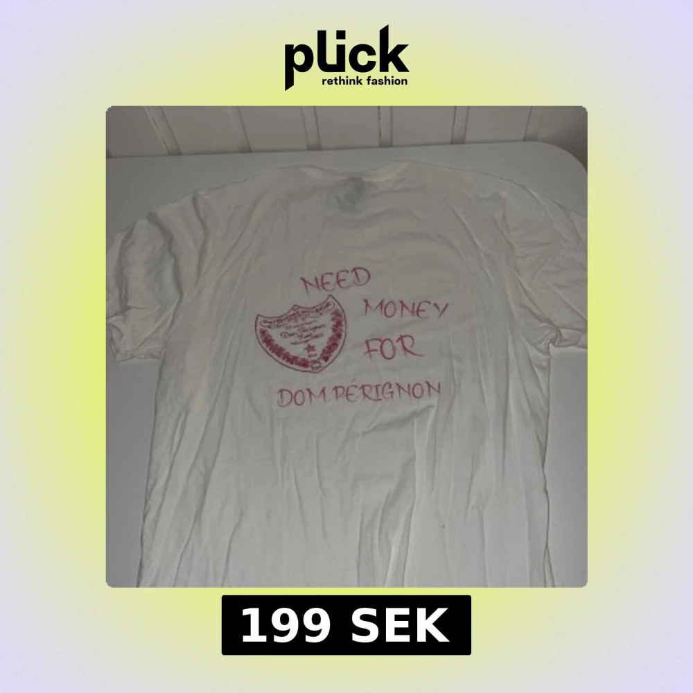 Vit t-shirt med rött tryck som säger 'Need Money for Dom Pérignon'. Trycket är på ryggen!