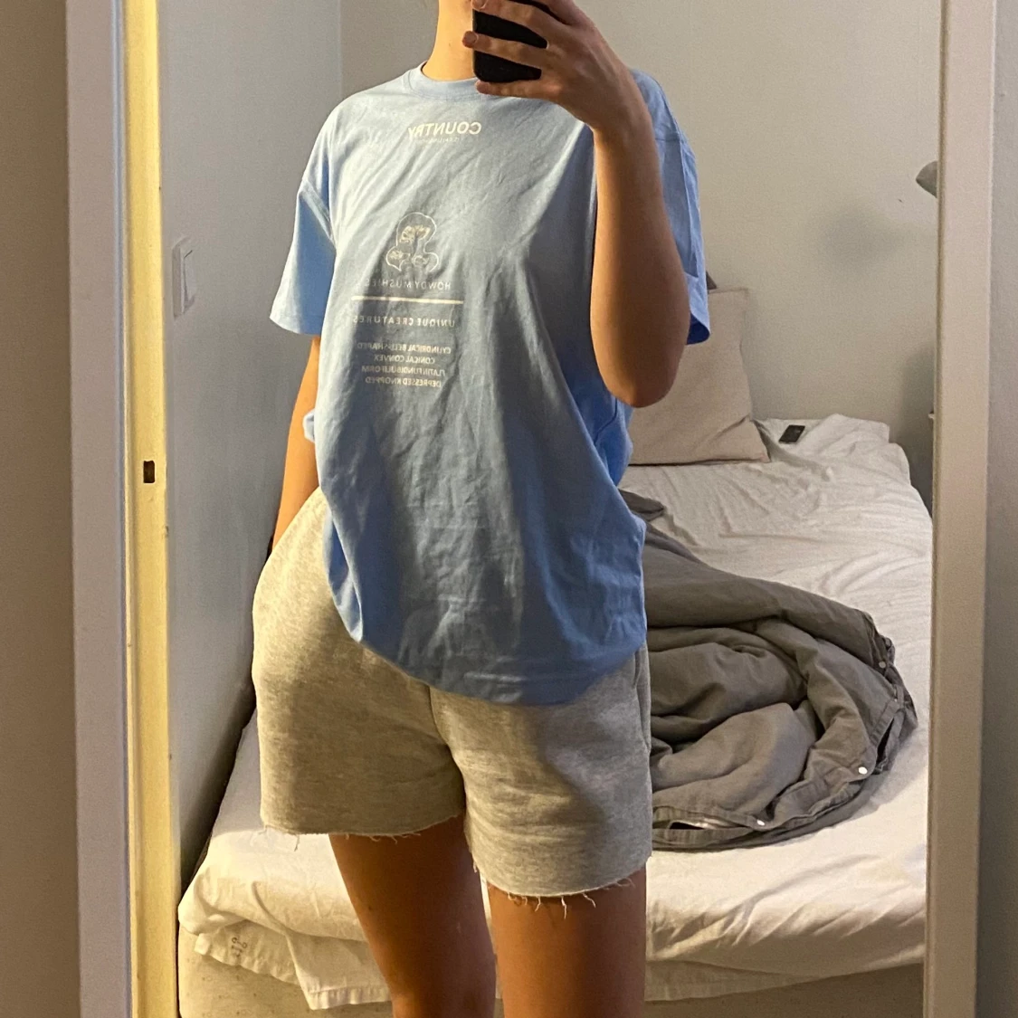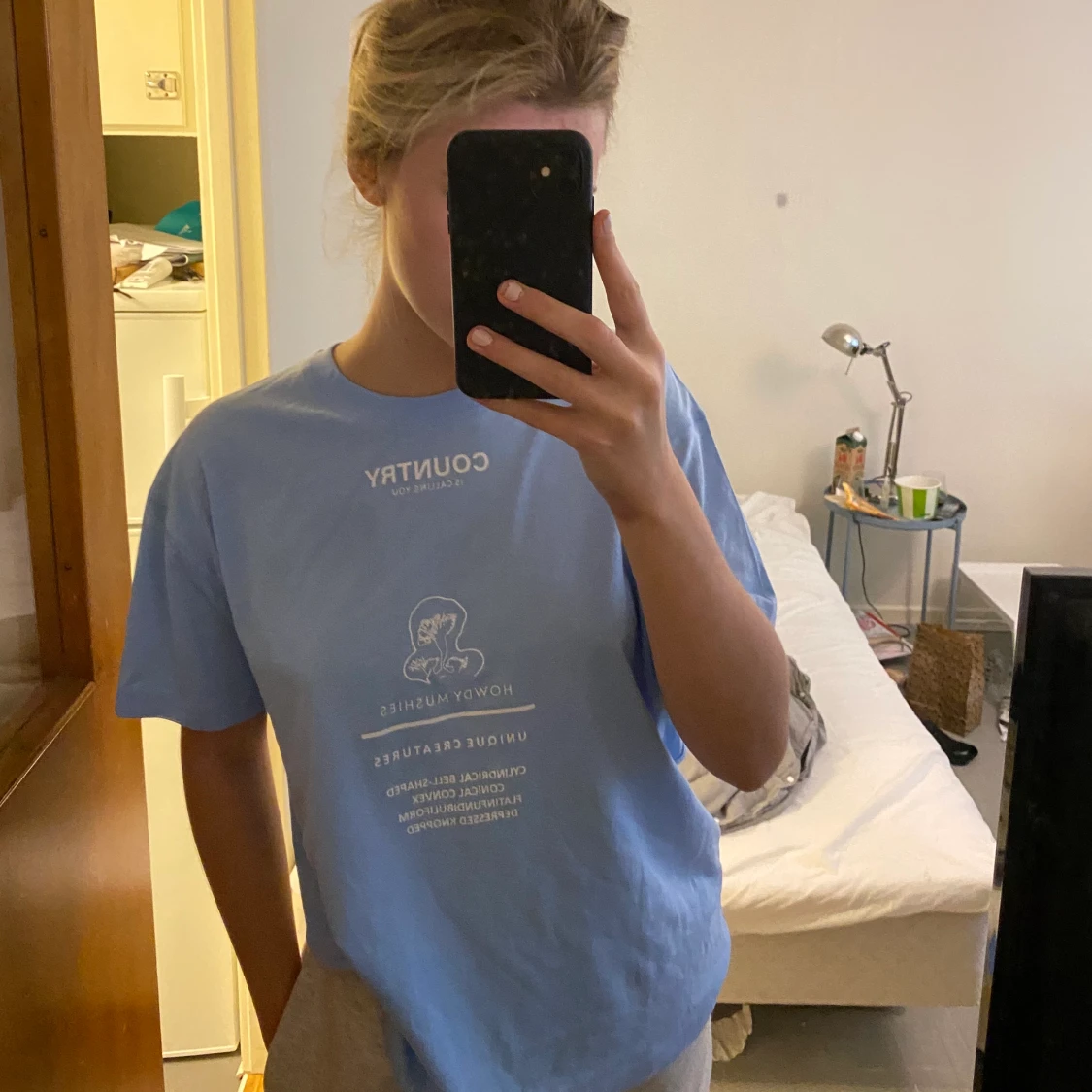 en ljusblå t-shirt från nelly med vit text. aldrig använd.