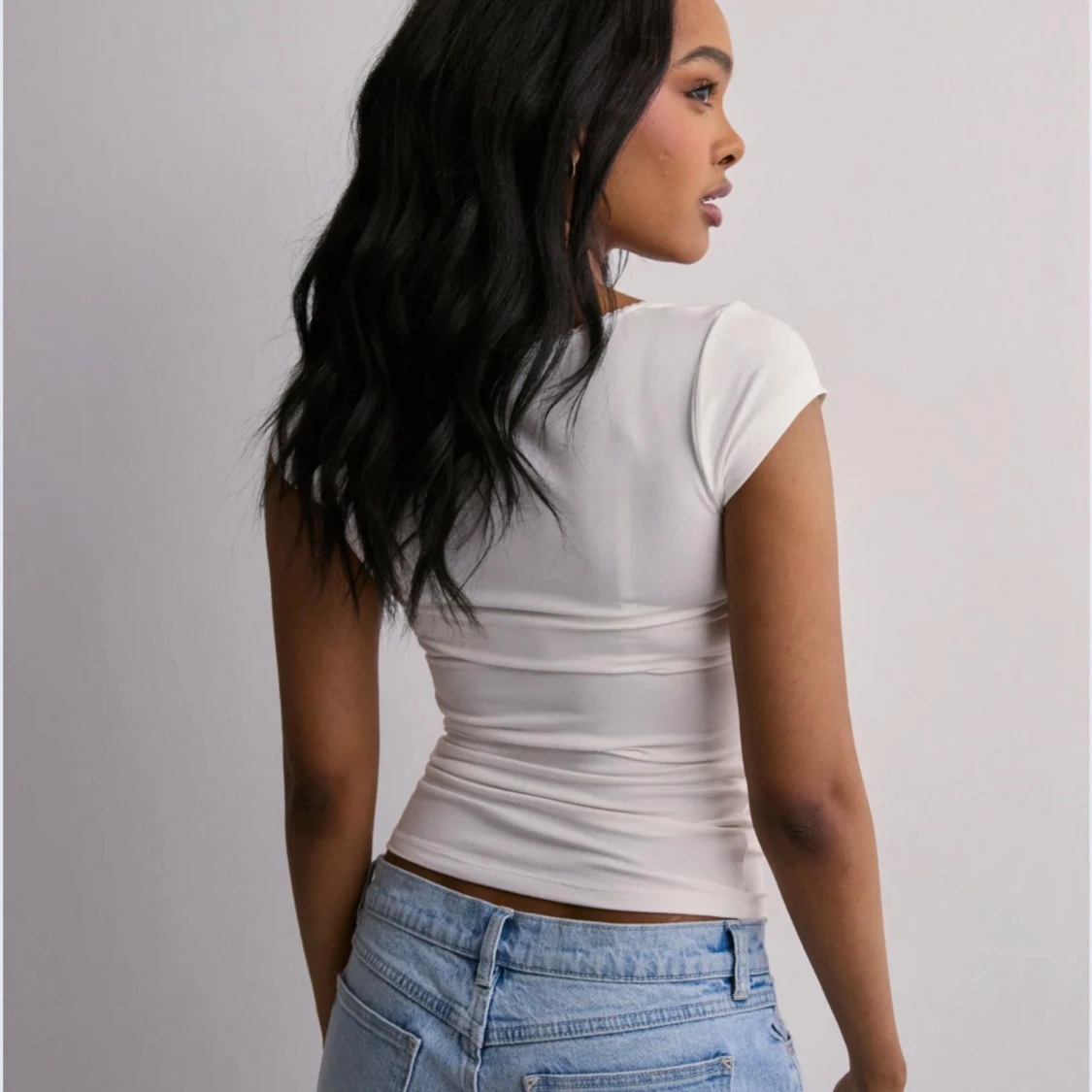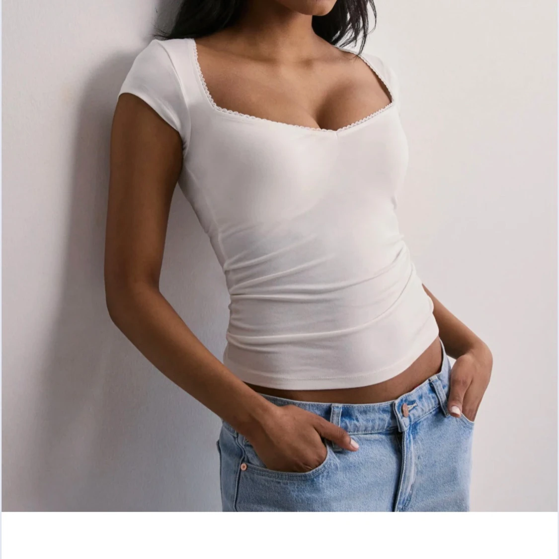 Jättefin vit topp från Nelly, endast använd 1 gång. Perfekt till sommaren. Toppen har lite spetsdetaljer💞💞