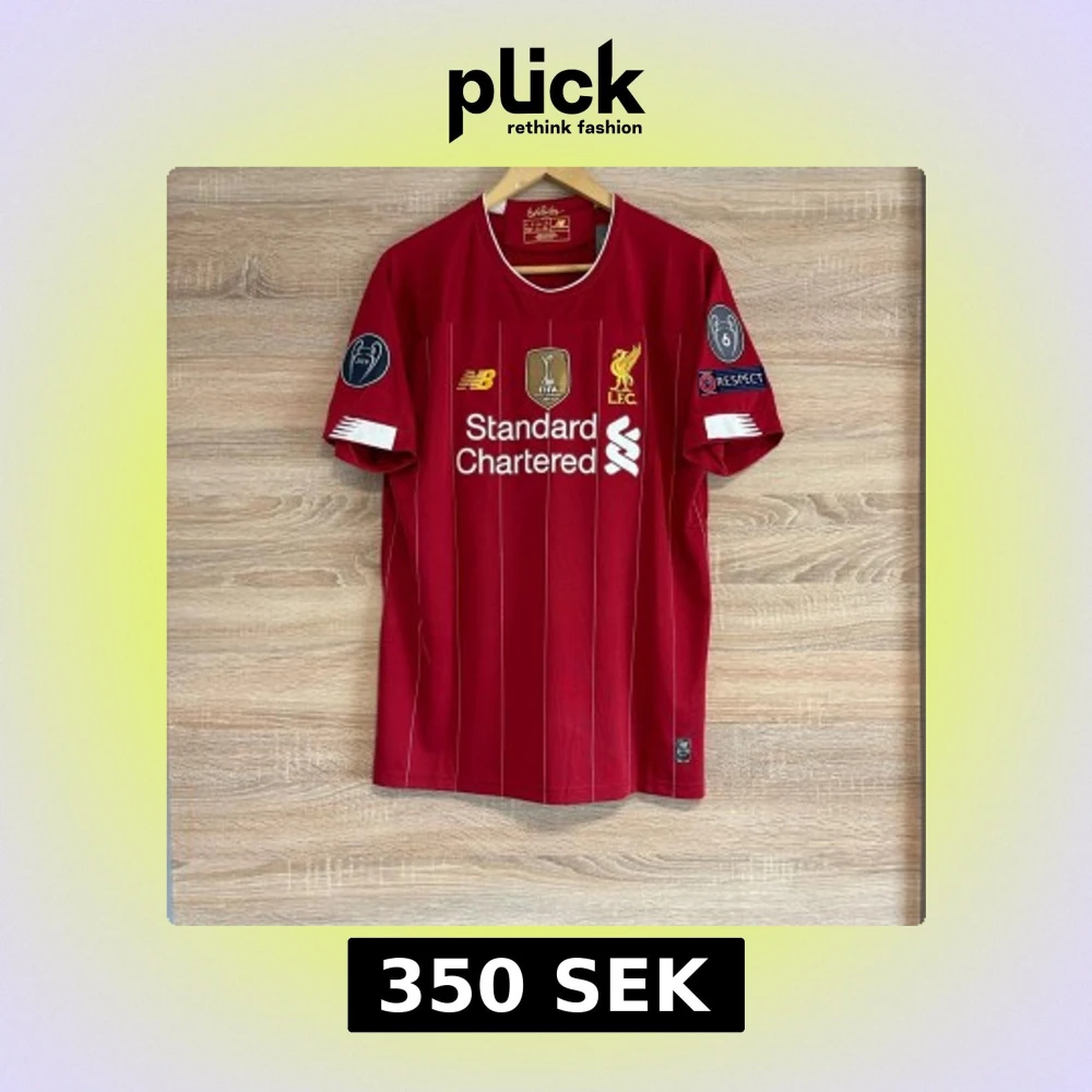 Säljer en röd Liverpool fotbollströja från New Balance med Firmino och nummer 9 på ryggen. Tröjan har korta ärmar och vita detaljer, inklusive klubbmärke och sponsorlogga. Perfekt för fans av Liverpool FC!