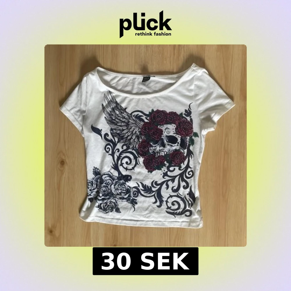 Säljer en vit croppad t-shirt från New Yorker med stort tryck av döskalle, rosor och vingar i svart och rött. T-shirten har korta ärmar och en bred, något båtringad hals. Perfekt för dig som gillar edgy stil!