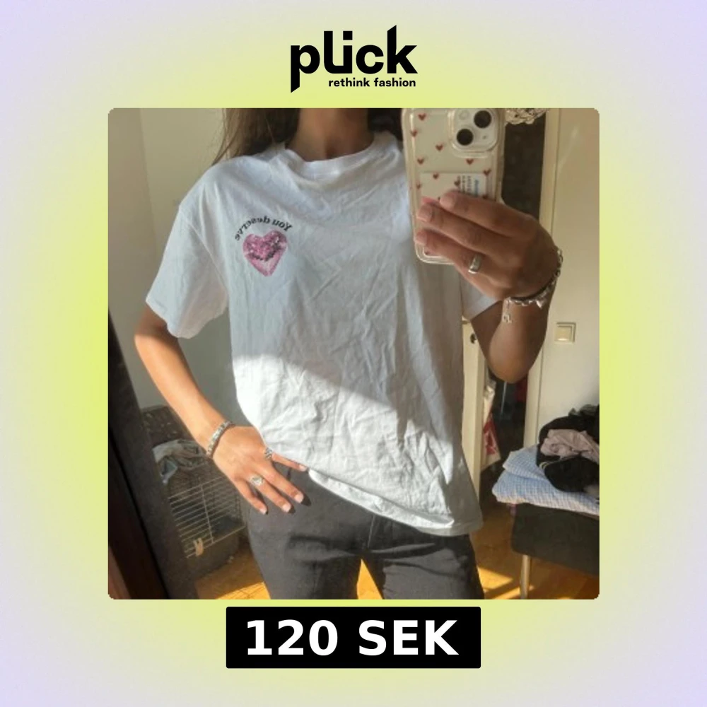 Vit t-shirt med tryck av ett rosa discokulshjärta Klassisk passform och korta ärmar, perfekt för en chill och personlig stil. Storlek XS men den är större i storleken! Aldrig använd