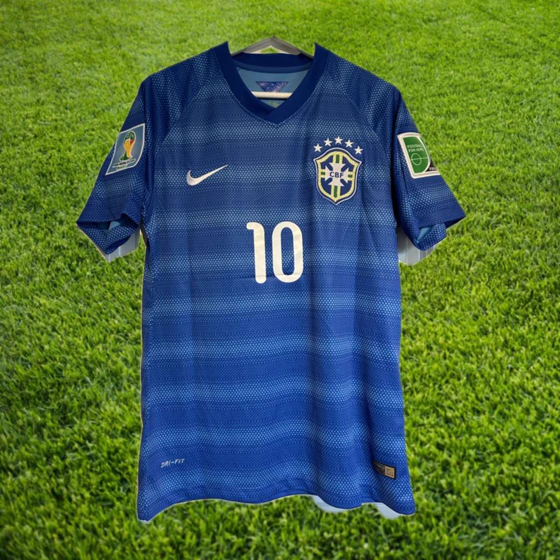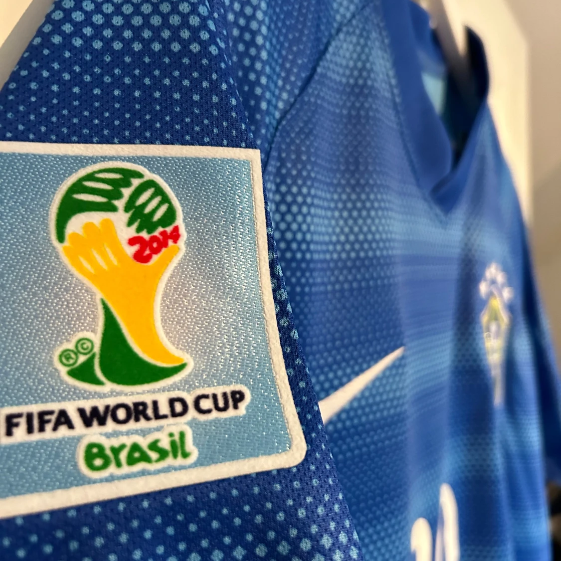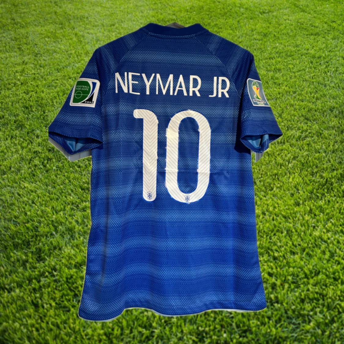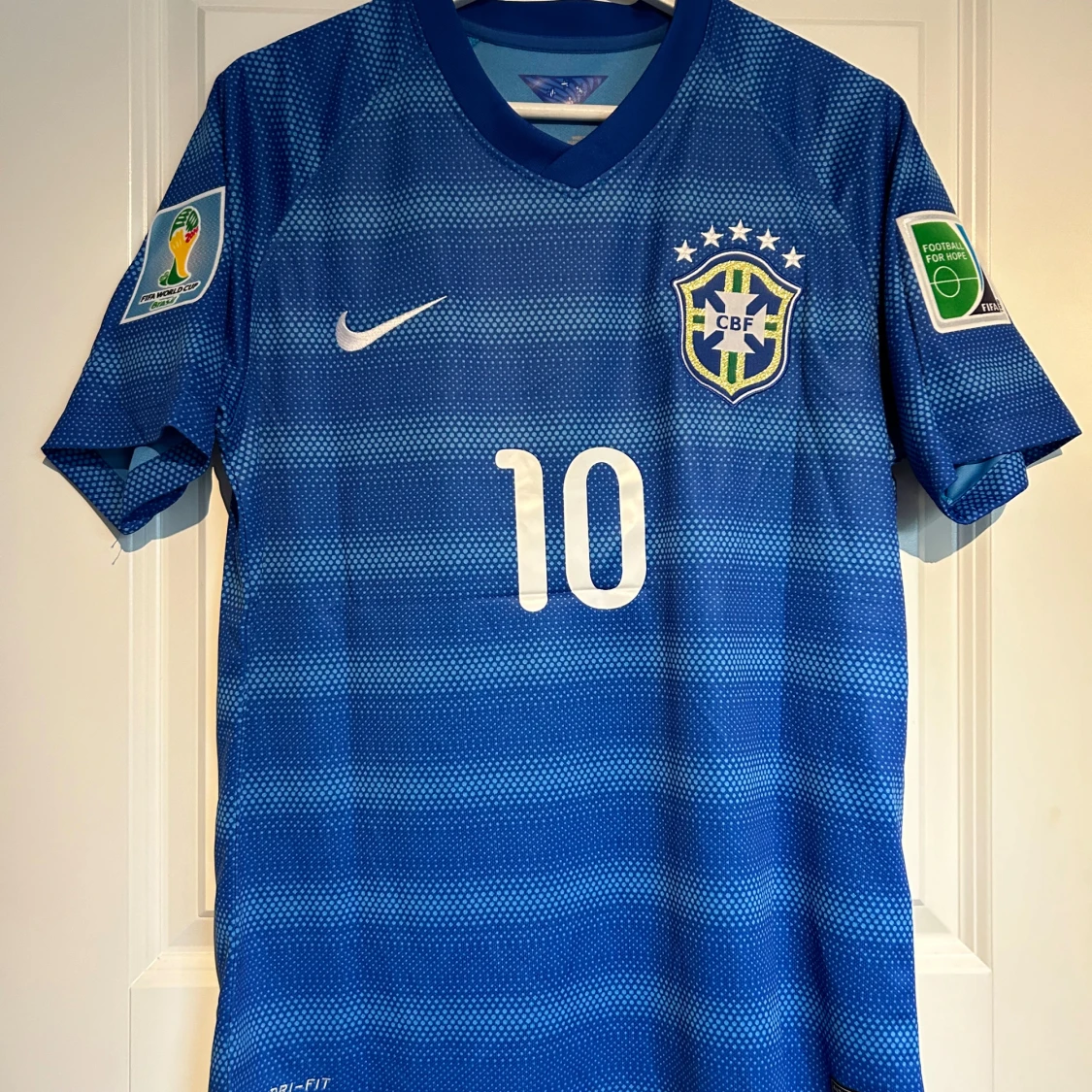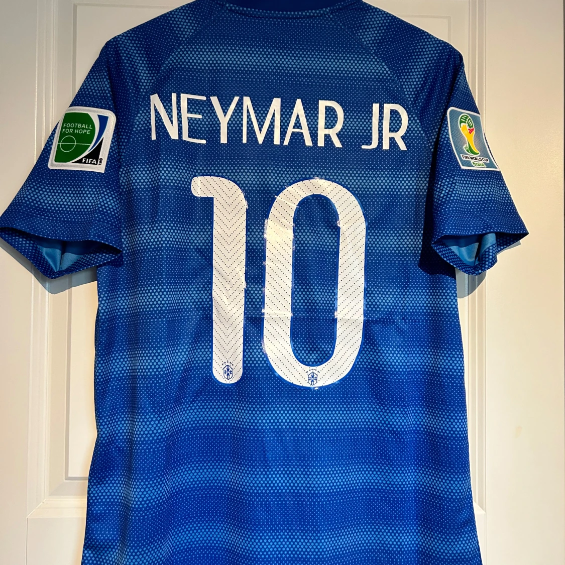 Säljer en blå Brasilien fotbollströja från VM 2014 med Neymar JR och nummer 10 på ryggen. Tröjan har korta ärmar CBF-emblem och FIFA World Cup-patchar på båda ärmarna. Tillverkad i lätt och ventilerande Dri-FIT-material. Tveka inte att höra av dig för mer bilder och information.