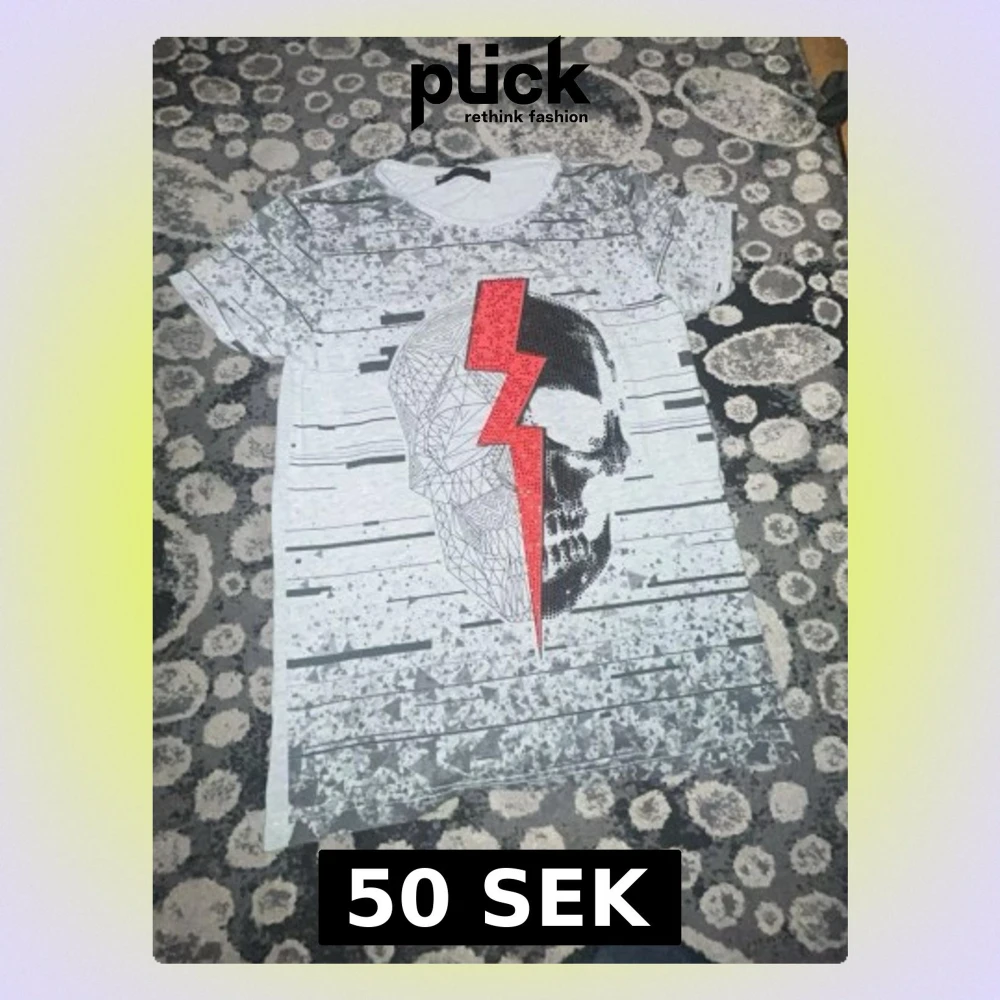 Säljer en grå t-shirt med ett stort tryck av en dödskalle och en röd blixt framtill. T-shirten har korta ärmar och ett grafiskt mönster i svart och vitt. Blixten är dekorerad med små röda nitar för extra edge. Perfekt för dig som gillar statement-plagg.