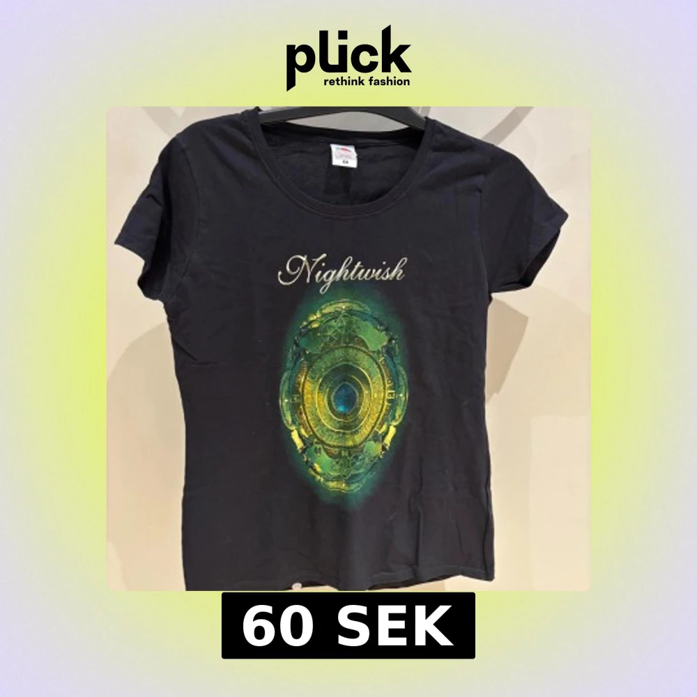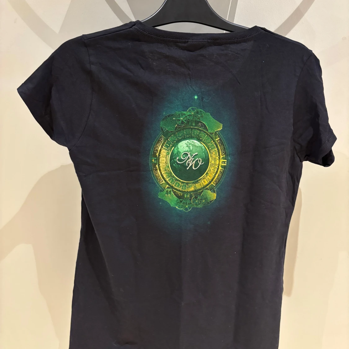 Svart t-shirt med Nightwish-tryck fram och bak i grönt och gult. Modellen är Lady Fit med rund hals och korta ärmar. Materialet är mjuk bomull och passformen är normal. Perfekt för dig som älskar bandmerch och vill sticka ut med snygg grafik.