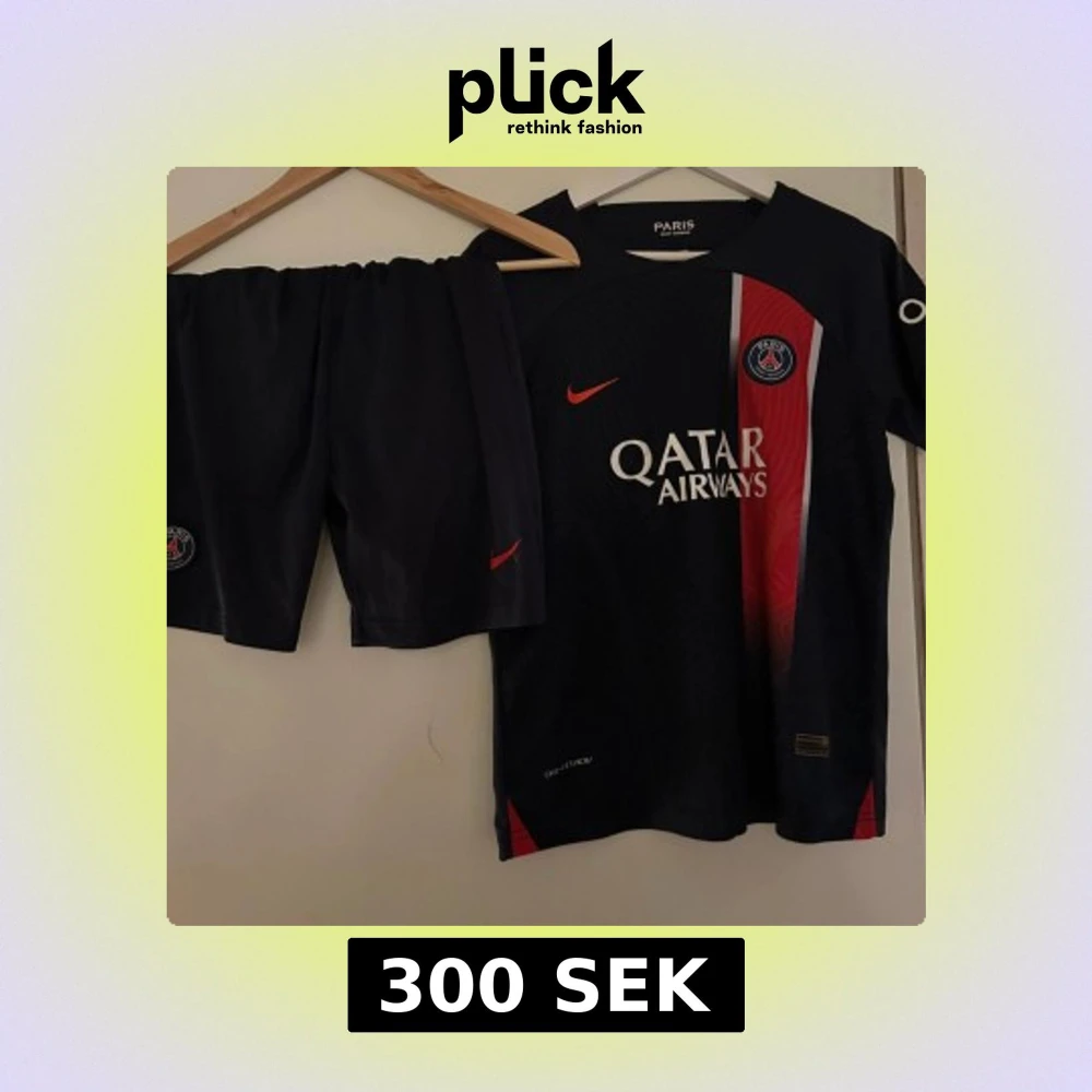 Paris Saint-Germain matchställ med kortärmad tröja och shorts. Tröjan är marinblå med röd och vit rand, PSG-logga på bröstet och Nike-logga i rött. Materialet är lätt och andas, perfekt för fotbollsträning eller match.