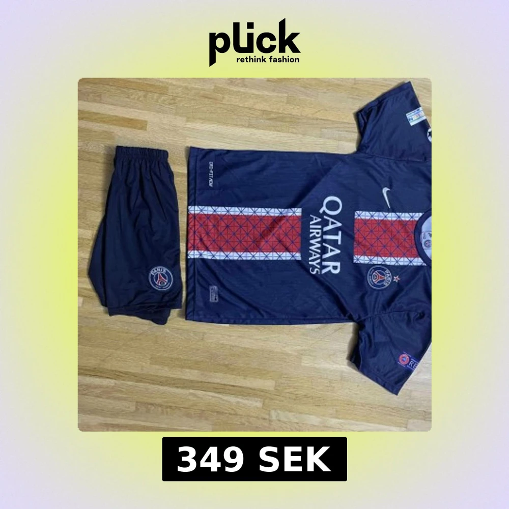 Paris Saint-Germain matchställ med tröja och shorts. Tröjan är mörkblå med röd och vit rand i mitten, PSG-logga, Qatar Airways-tryck och Nike-märke. Nummer 14 och D. Doué på ryggen. Korta ärmar, snabbtorkande material, officiella Champions League och Respect-patchar.