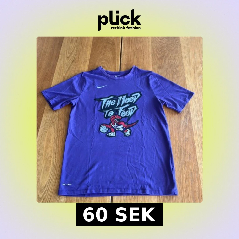 Lila Nike Dri-Fit t-shirt med coolt tryck på bröstet: 'The Need To Feed' och en tecknad röd dinosaurie med basketboll. Klassisk rund hals och korta ärmar. Perfekt för dig som gillar sportig streetstyle och vill sticka ut.