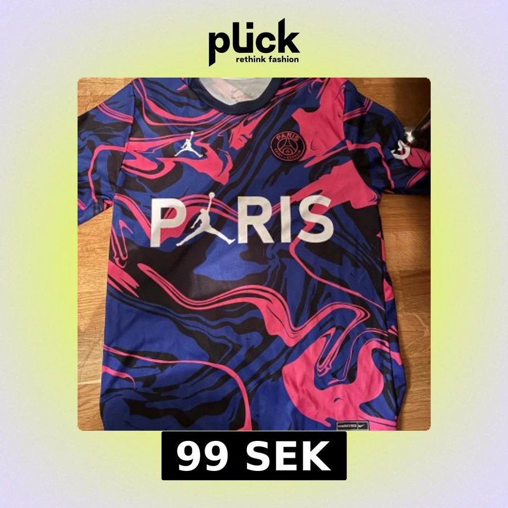 Säljer en fet PSG fotbollströja med Mbappé #7 på ryggen. Tröjan är kortärmad och har ett galet mönster i blått, svart och rosa med Paris-logga och Jordan-märke på bröstet. Tillverkad i lätt Dri-FIT material som andas, perfekt för match eller träning.