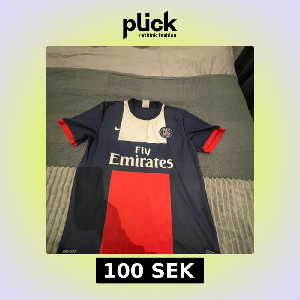 Paris Saint-Germain matchtröja med Ibrahimović 10 på ryggen. Tröjan är marinblå med röd och vit detalj, klassisk Nike Dri-FIT med korta ärmar och klubbmärke på bröstet. Snygg design med Fly Emirates-tryck framtill och röda muddar.