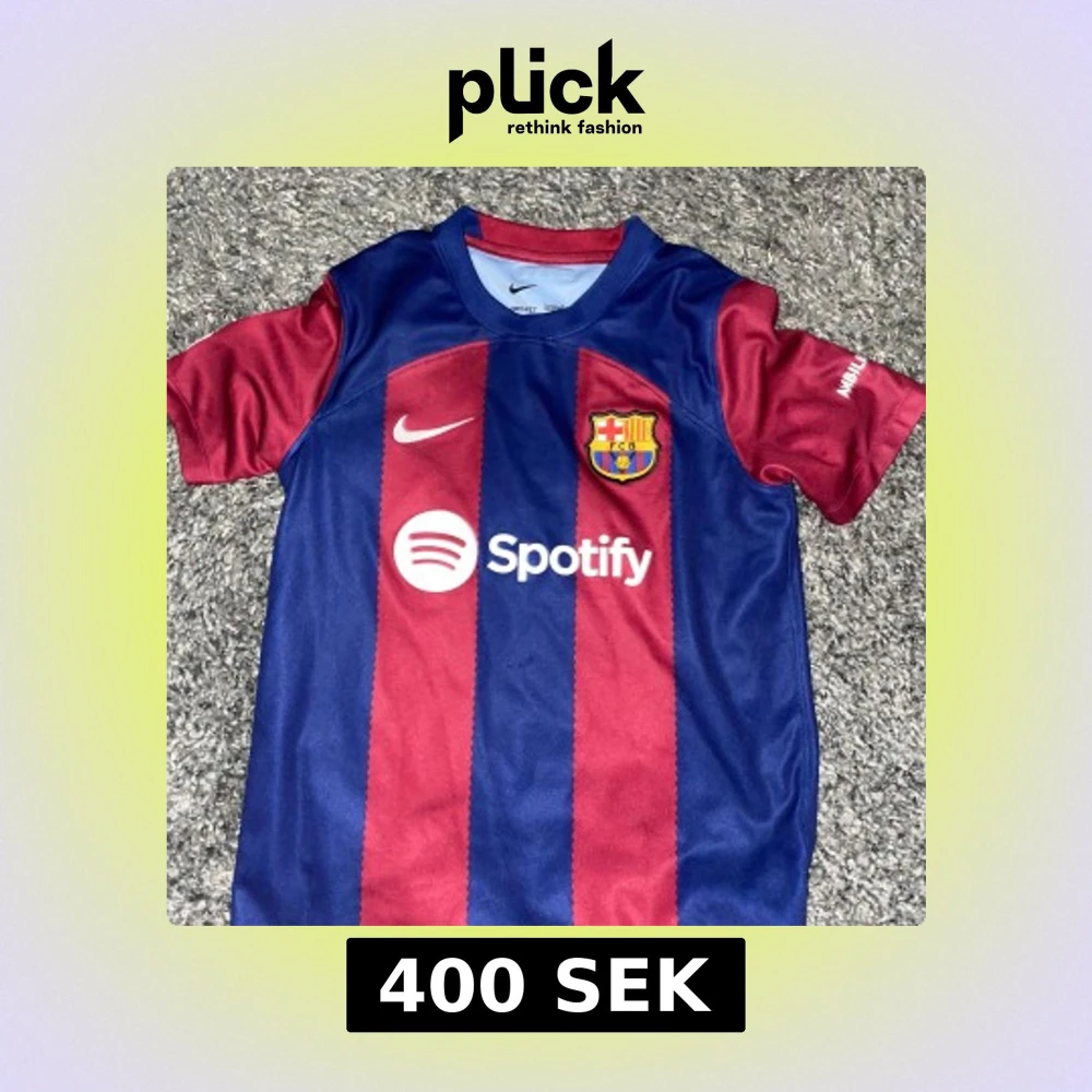 Säljer en FC Barcelona hemmatröja från Nike med breda blå och röda ränder, klubbmärke och sponsorlogga på bröstet. Tröjan är kortärmad och har rund hals. Perfekt för dig som älskar Barca! Tröjan är köpt för 1200 i Barcelona shopen i Spanien därför är den 400