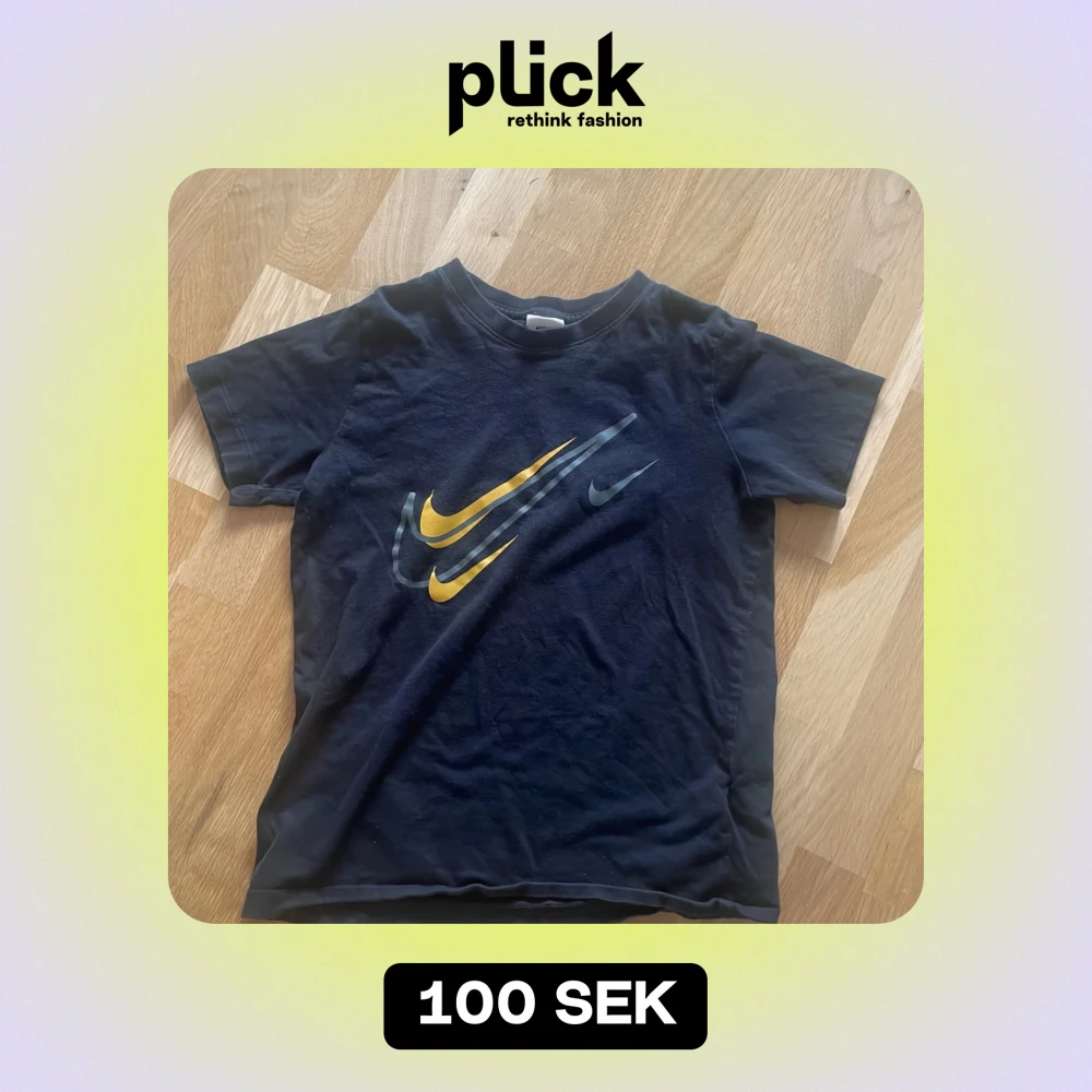 Säljer en svart t-shirt från Nike i bra skick. Den har ett coolt tryck med flera Nike-loggor i gult och grått på framsidan. Perfekt för vardagsbruk eller träning. Materialet känns mjukt och bekvämt. Passar både för sommar och vår.