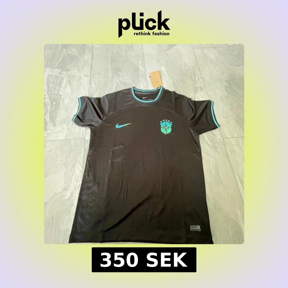 Säljer en svart Brasilien fotbollströja från Nike med turkosa detaljer och emblem på bröstet. Tröjan har korta ärmar och är tillverkad i Dri-FIT-material som andas. Perfekt för fotbollsträning eller att bära som supporter.