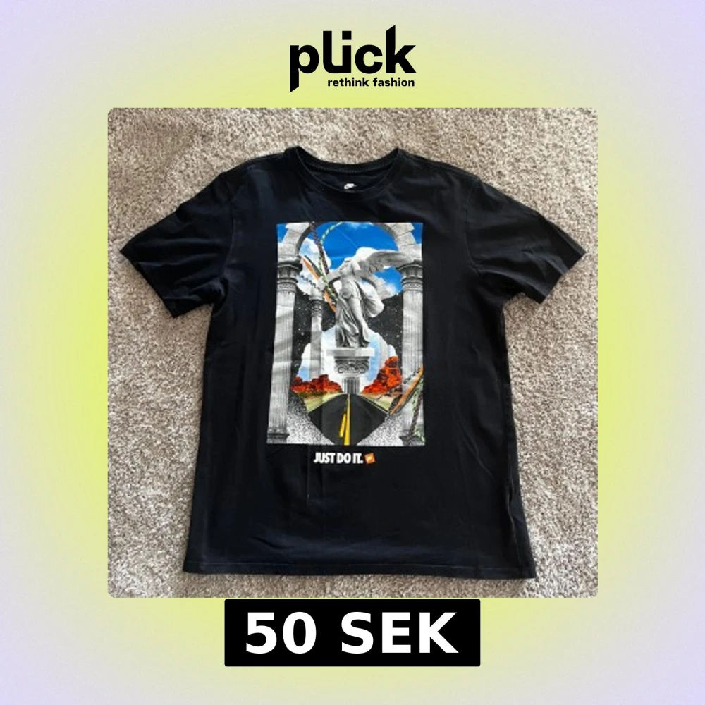 Svart t-shirt från Nike med stort grafiskt tryck framtill som föreställer en staty, pelare och landskap. Texten 'Just Do It.' under motivet. Klassisk passform och rund halsringning.