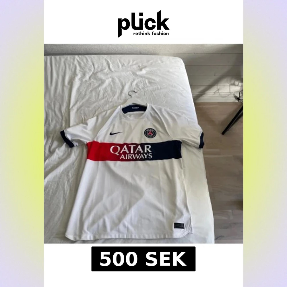 Paris Saint-Germain fotbollströja i vitt med breda horisontella ränder i rött och mörkblått över bröstet. PSG-logga och Nike swoosh på bröstet, Qatar Airways-tryck framtill. Klassisk rund hals och korta ärmar. Tillverkad i lätt och ventilerande material. Köpt på Zalando för 1200 kr, säljer den då den inte används nånting. Jätte fin å utan skavanker eller fläckar.
