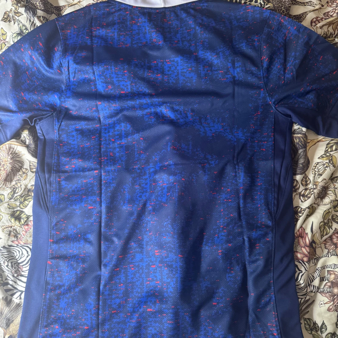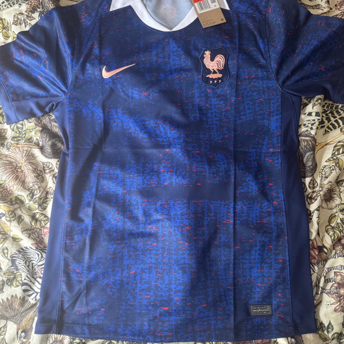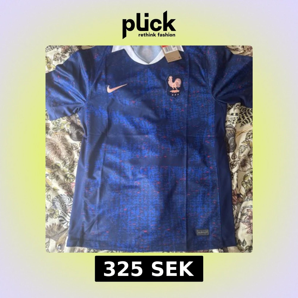 Säljer en officiell Frankrike fotbollströja från Nike med korta ärmar. Tröjan har ett digitalt mönster i olika blå nyanser med små röda detaljer och vit krage. FFF-logga med tupp på bröstet och Nike swoosh i guld. Materialet är lätt och andas, perfekt för match eller träning.