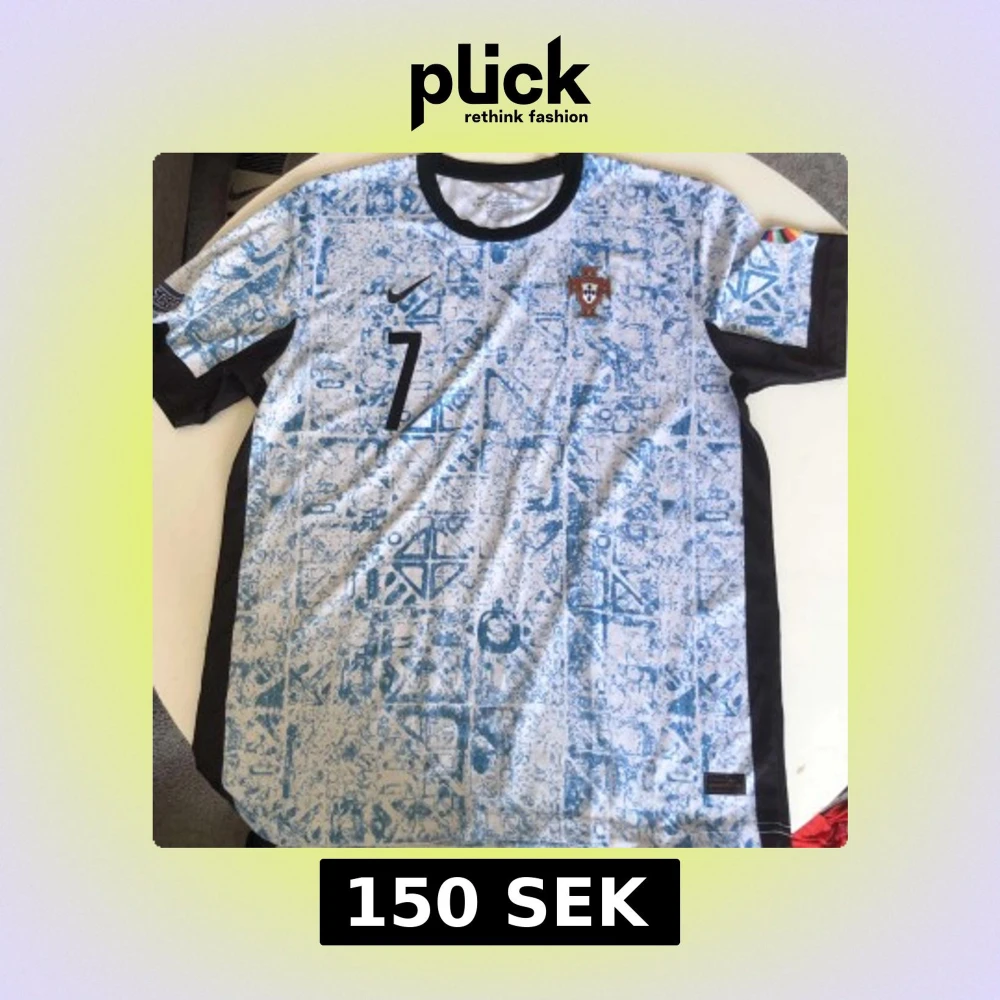 Portugal fotbollströja med Ronaldo och nummer 7. Tröjan är kortärmad med vit bas och blått mönster, svarta detaljer på krage och ärmslut. Nike-logga och Portugals landslagsemblem på bröstet. Tillverkad i lätt och ventilerande material, perfekt för match eller träning. Klubbloggan på bröstet är lite skadat