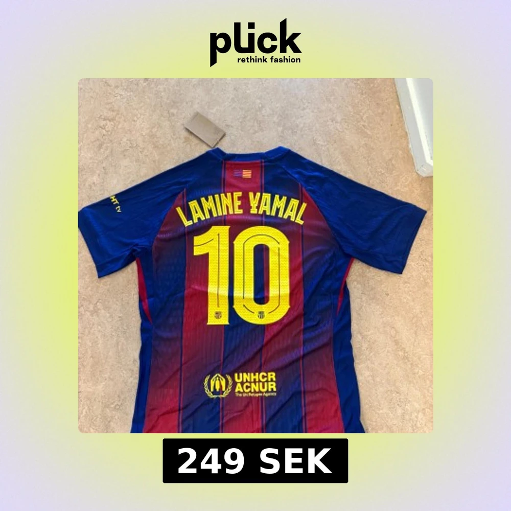 Säljer en officiell FC Barcelona matchtröja från Nike med Lamine Yamal och nummer 10 på ryggen. Tröjan är blå och röd med gula detaljer, randigt mönster och klubbmärke på bröstet. Tillverkad i lätt och ventilerande Dri-Fit material.