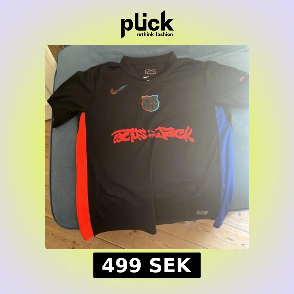 Säljer en svart FC Barcelona x Nike fotbollströja med Travis Scott Cactus Jack-grafik i rött över bröstet. Tröjan har klubbmärke med blå och röd kant, Nike-logga i rött och blått samt röda och blå sidopaneler. Tillverkad i lätt och ventilerande material.