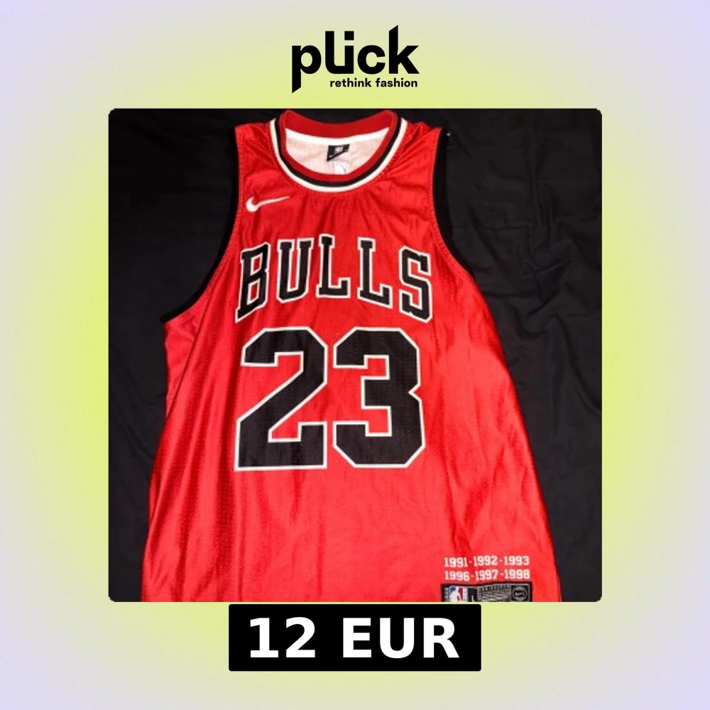 Säljer en ikonisk Chicago Bulls baskettröja med Michael Jordans nummer 23. Tröjan är röd med svarta och vita detaljer, stora tryck fram och bak, samt broderade NBA- och Nike-loggor. Tillverkad i ventilerande meshmaterial, perfekt för basket eller streetwear.