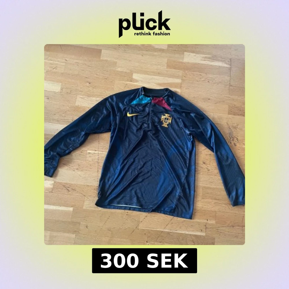 Snygg långärmad fotbollströja från Nike med Portugals landslagsemblem på bröstet. Tröjan är mörkblå med detaljer i gult, rött och turkos vid halsen samt gul Nike-logga. Tillverkad i lätt och ventilerande material, perfekt för träning eller match.