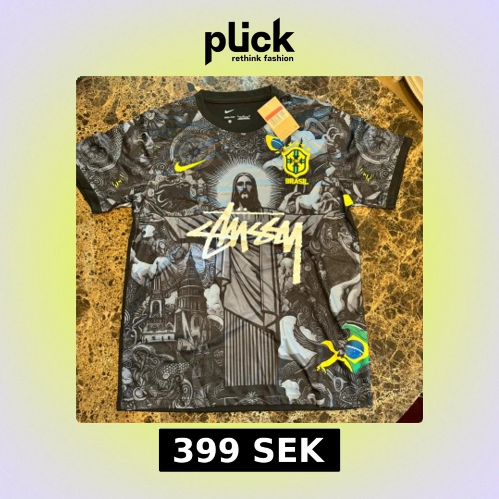 Unik Brasilien fotbollströja från Nike och Stüssy med svart och grått konstnärligt mönster, stora tryck av Kristusstatyn och kyrkor, samt Brasil-logga och flagga. Kortärmad, Dri-FIT-material för bästa komfort. Stüssy-logga i vitt framtill och gula detaljer.